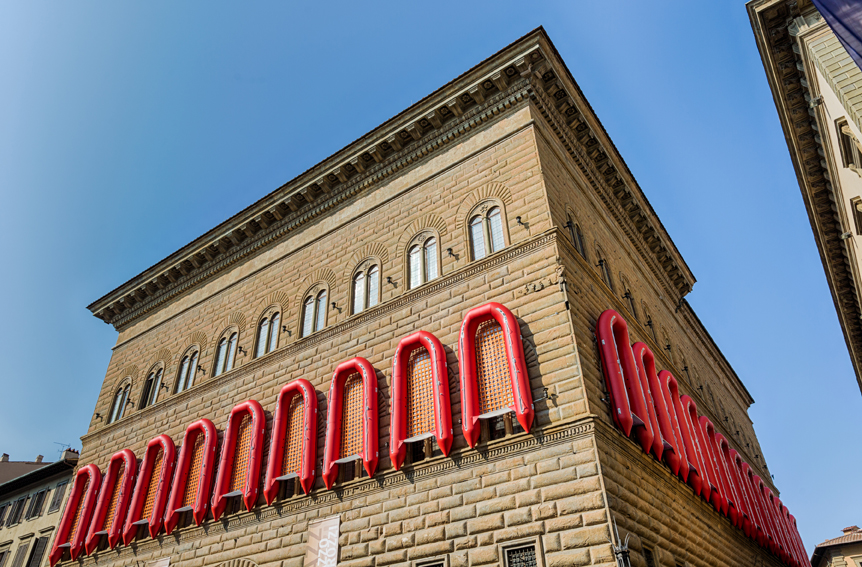 ‘Ai Weiwei: Libero’. La mostra a Palazzo Strozzi si preannuncia già dalla facciata dell’edificio rinascimentale su cui l’artista cinese è intervenuto incorniciando le finestre del Piano Nobile con 22 gommoni che rievocano la tragedia dell’immigrazione dei nostri tempi. Il controverso artista – noto per mescolare provocatoriamente ricerca artistica e attivismo politico – ha letteralmente invaso il museo (compreso lo spazio della Strozzina) con installazioni site specific e lavori storici, tra questi l’installazione di ruote di bicicletta (Stacked) che rievoca il ready made duchampiano, l’opera in cui distrugge i vasi della dinastia Han di cui è attento collezinoista, o i ritratti Lego di dissidenti politici quali Dante, Filippo Strozzi, Savonarola e Galileo. Piazza degli Strozzi, fino al 22 gennaio.