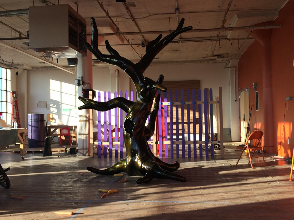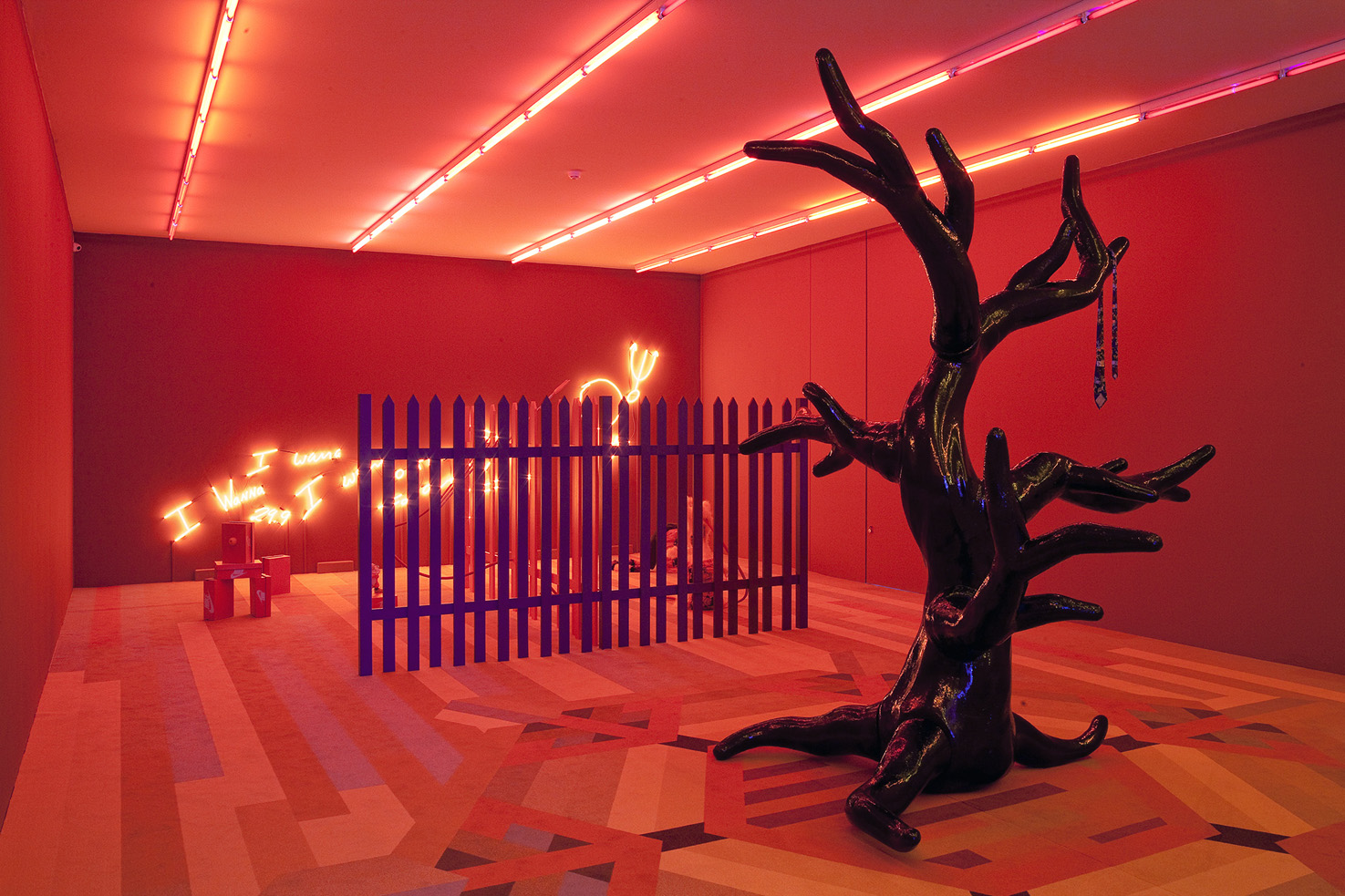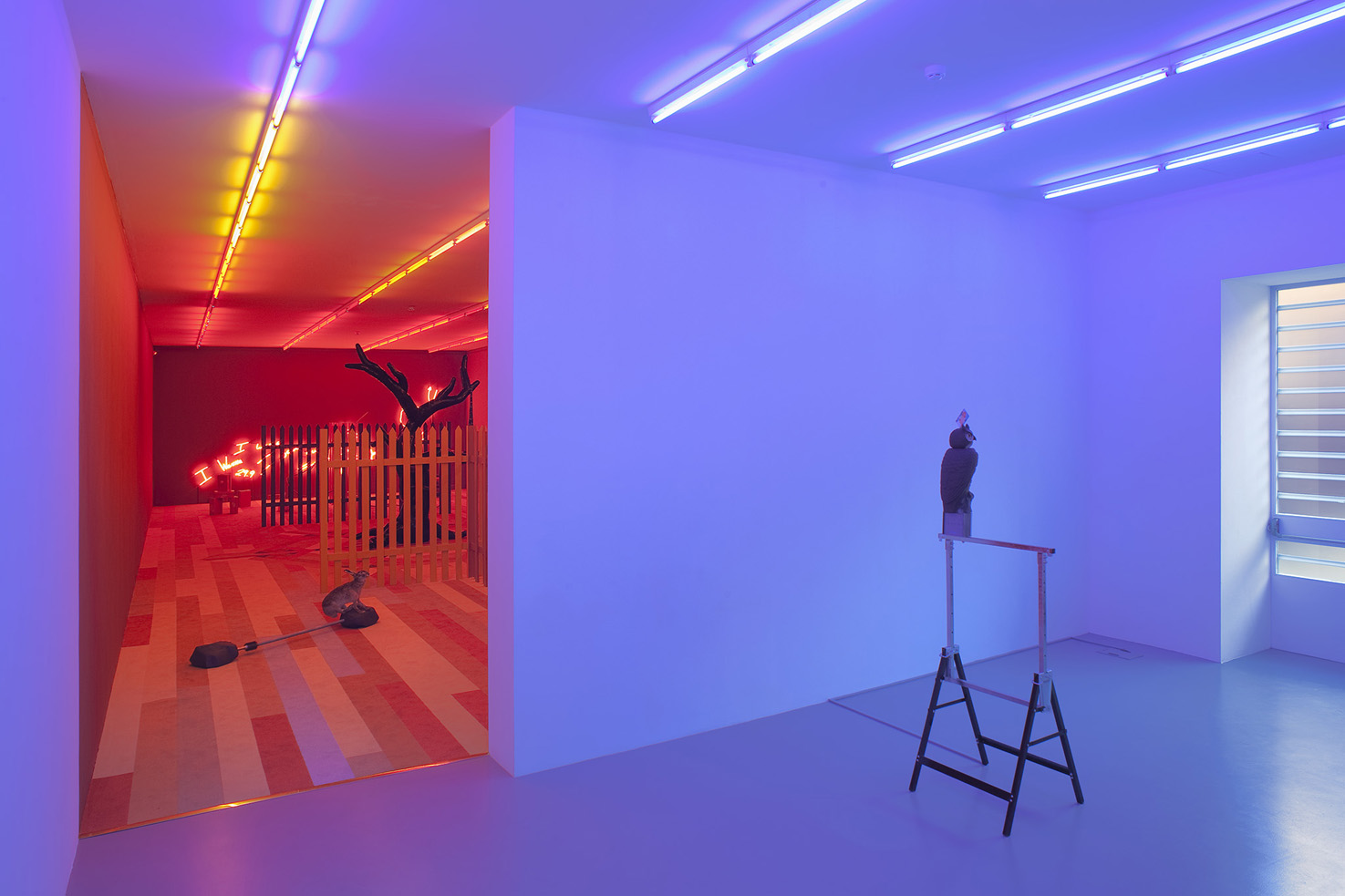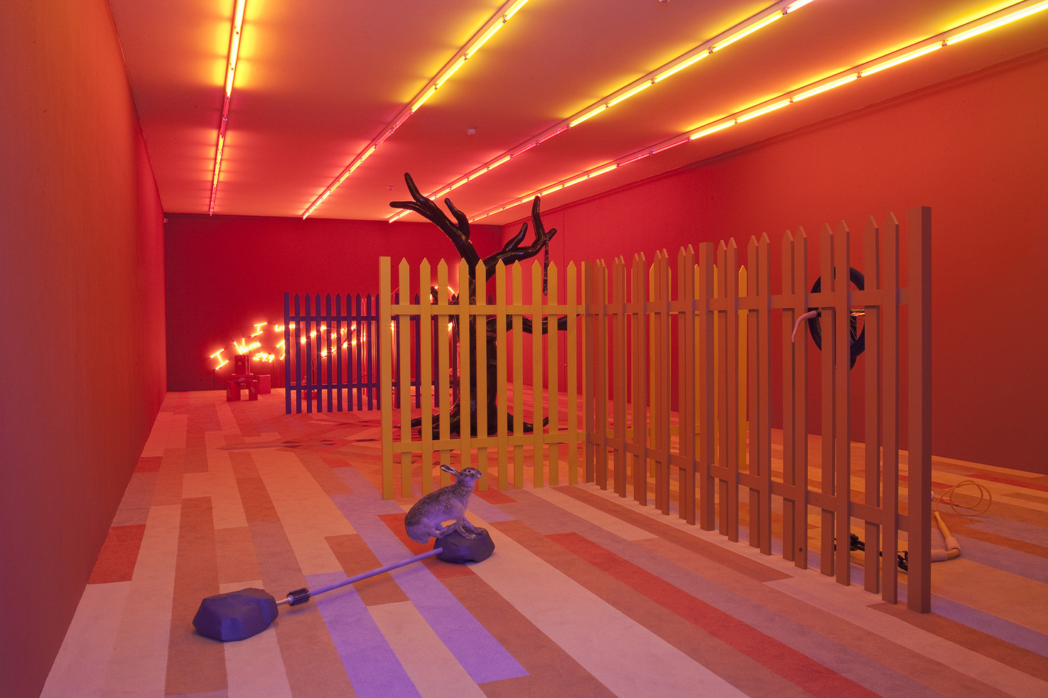 La sua prima mostra in Italia, Devil town, ha aperto i battenti alla galleria Giò Marconi di Milano che, avendo inaugurato meno di tre mesi fa la nuova location, si è vista stravolgere lo spazio espositivo dall’artista di Philadelphia, originariamente concepito dagli architetti Kuehn Malvezzi secondo il modello del “white cube”. Alex Da Corte ha invece pittato i muri di rosso rugginoso, srotolato una moquette multicolor a terra e costruito uno scenario fatti di stralci di mondo ispirato ad Aspettando Godot di Samuel Beckett: un albero spoglio, una staccionata, una lepre, un mucchio di sneakers accatastate al muro. Il tutto inserito nella densa atmosfera creata da un’installazione sapiente di luci al neon. Un lavoro che farebbe invidia, tra l’altro, a un consumato decoratore d’interni, come Da Corte ha già avuto modo di dimostrare con la precedente personale Die Hexe alla galleria Luxemburg & Dayan di New York inaugurata lo scorso febbraio, dove una serie di stanze psichedeliche si apriva sul mondo lisergico dell’artista.