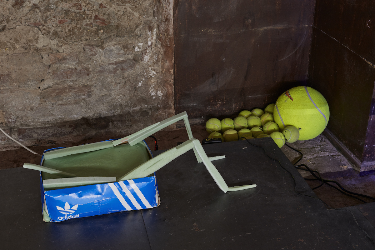 Altro spazio suggestivo da visitare è la grande Sala Convegni a Palazzo De’ Toschi dove è allestita la mostra Miss America di Francisco Tropa. Prima grande mostra in Italia (promossa da Banca di Bologna) dopo la partecipazione dell’artista al Padiglione Portoghese della Biennale di Venezia del 2011, il progetto espositivo bolognese ospita uno dei lavori recenti più iconici dell’artista: Lantern with clock mechanism (2025), in cui l’ombra proiettata in grandi dimensioni è quella di un meccanismo a orologeria in funzione. Fa da pendant a questa installazione, Miss America, l’opera che dà il titolo alla mostra: una creazione inedita che combina installazione e performance ed è allestita e disallestita ciclicamente in presenza del pubblico per tutta la prima settimana di apertura, per poi essere esposta in forma statica.