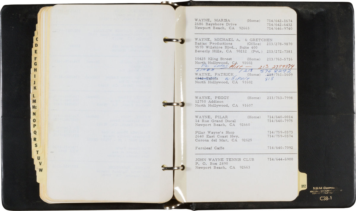 Rubrica telefonica ad anelli di John Wayne del 1976. Sono scritti a macchina e annotati a mano moltissimi indirizzi e numeri di telefono di amici, parenti, noti colleghi e dei presidenti Jimmy Carter e Gerald Ford. Valore stimato oltre 1.000 dollari