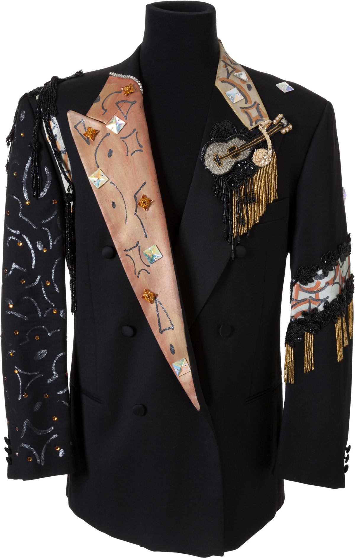 Giacca di Giorgio Armani della linea Mani indossata sul palco da Johnnie Taylor. La giacca taglia 42R è stata abbellita secondo lo stile dell’artista. Valore stimato: oltre 700 dollari