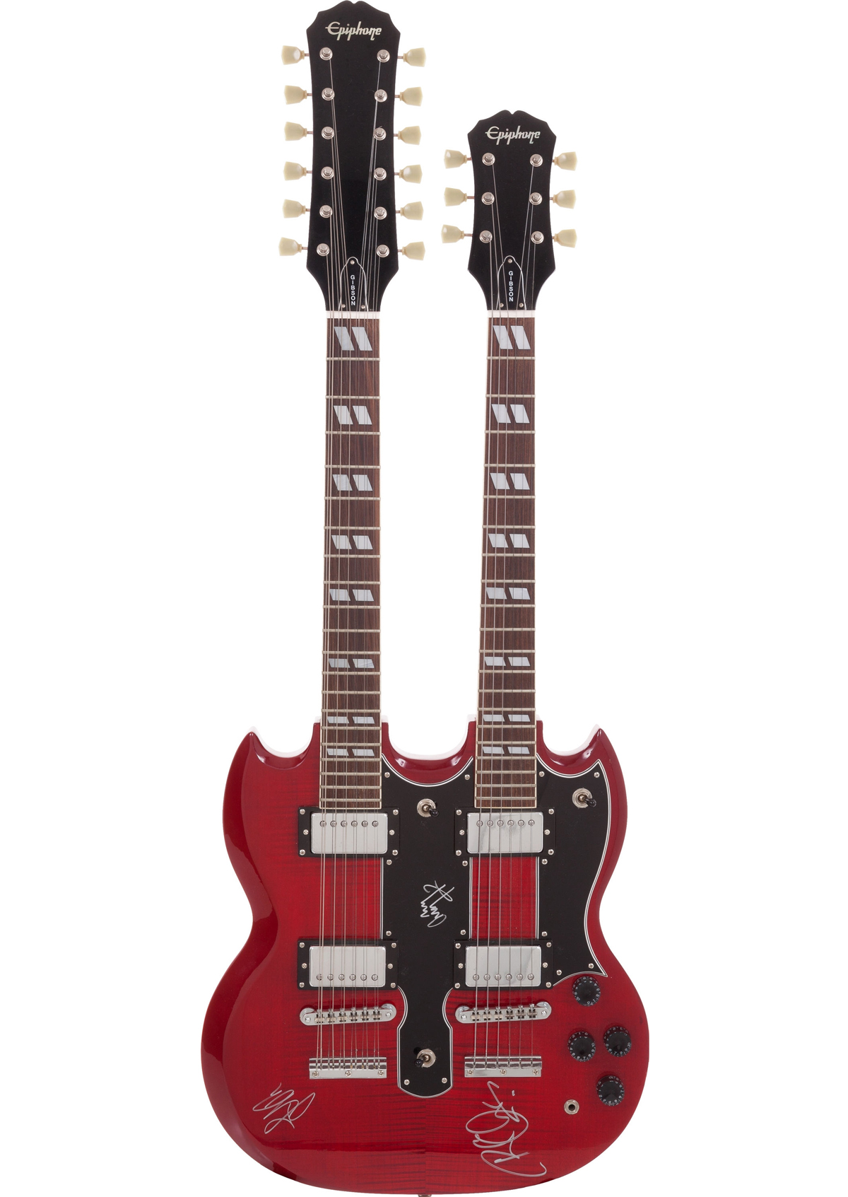 Chitarra elettrica Gibson Epiphone a doppio manico autografata dai tre membri viventi della band Led Zeppelin: Jimmy Page, Robert Plant e John Paul Jones. Valore stimato: oltre 4.500 dollari.