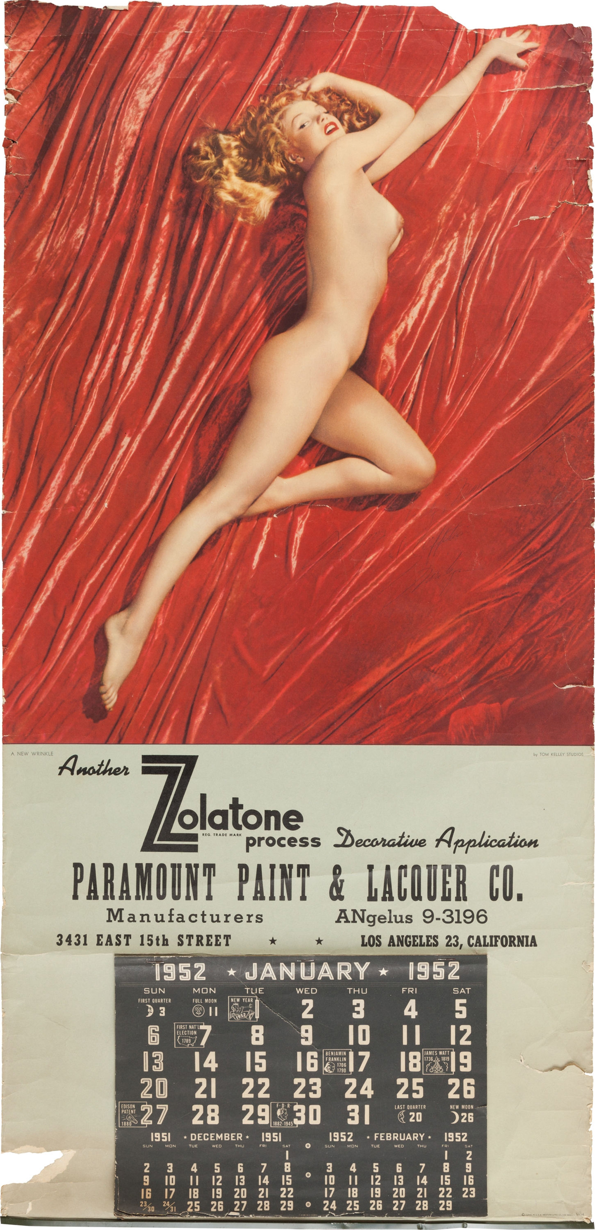 Pagina di calendario del 1952 con firma e dedica scritta da Marilyn Monroe. L’inchiostro nero è poco leggibile: "To my buddy, Mary / Love and Affection / Marilyn".