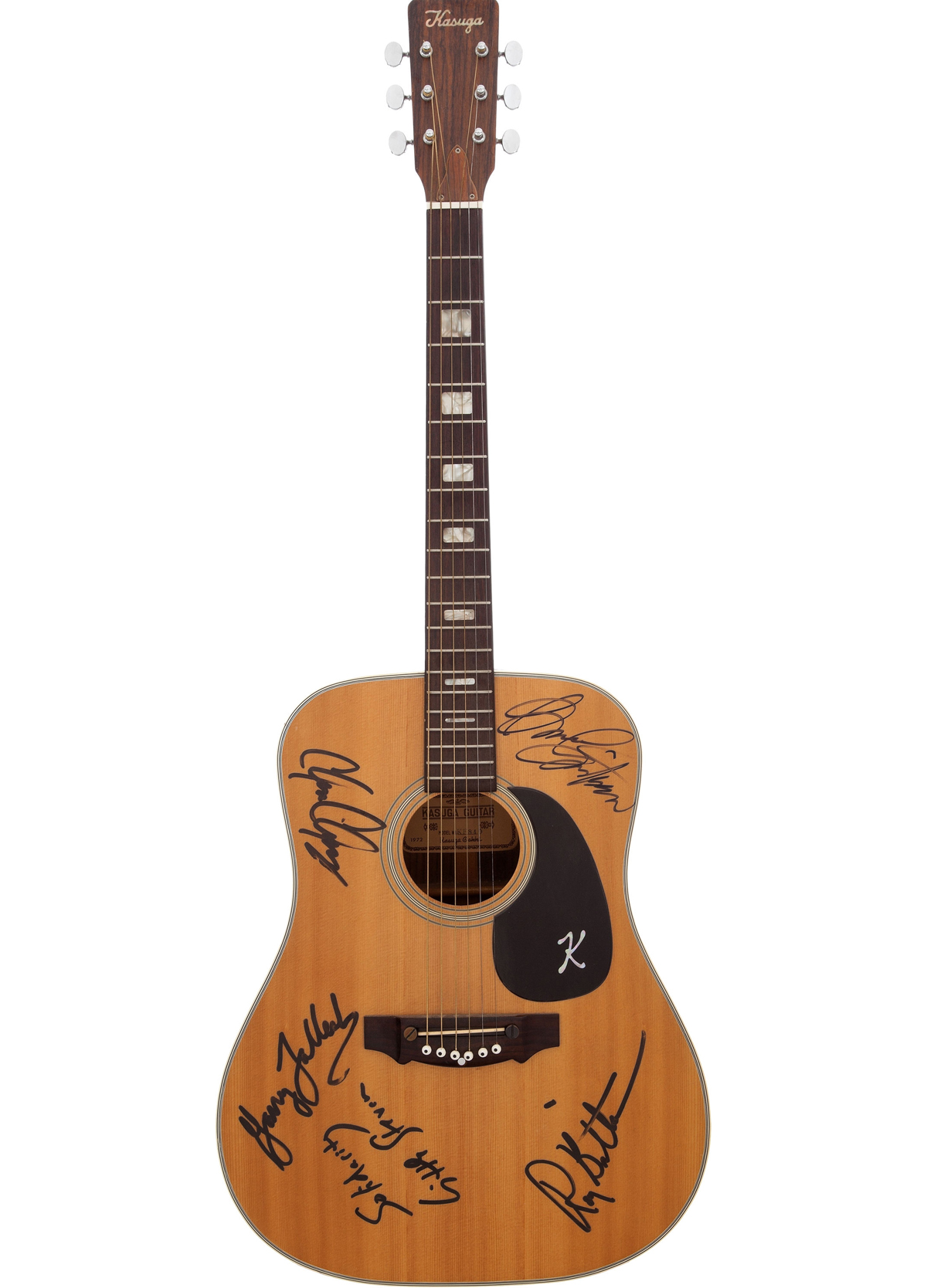 Chitarra acustica Kasuga KF-840 del 1972 firmata da Bruce Springsteen e dalla E Street Band. Valore stimato: oltre 2.500 dollari.
