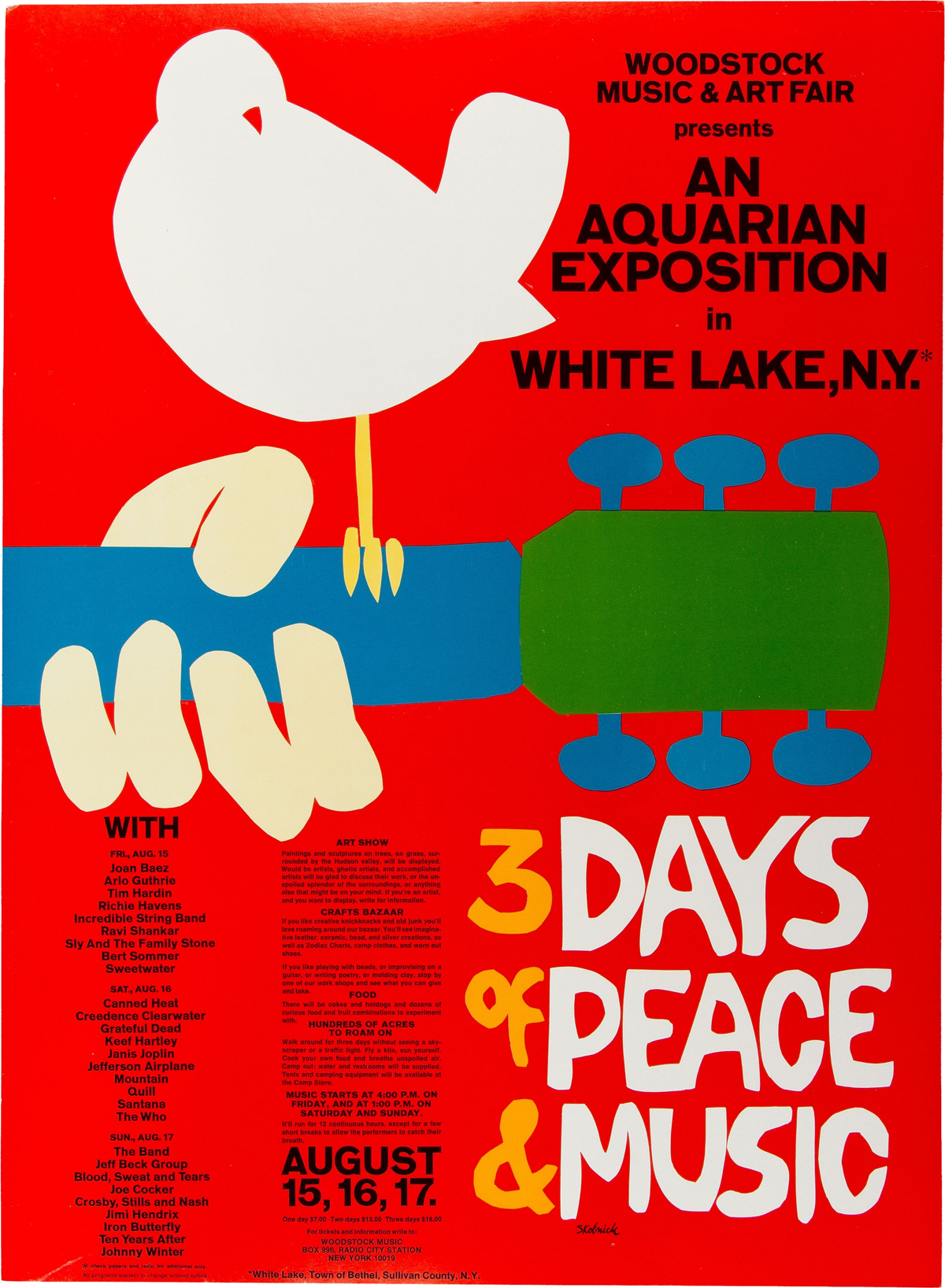 Poster originale del mitico concerto di Woodstock del 1969, uno degli eventi musicali più importanti di tutti i tempi. Valore stimato: oltre 1.800 dollari.
