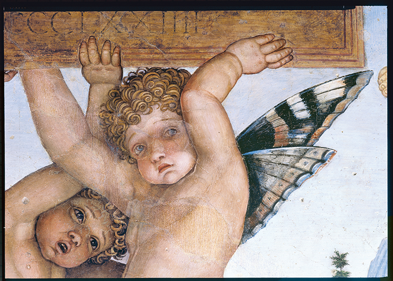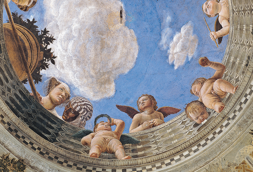 La “cartolina” universalmente conosciuta della Camera Picta, però, è quella dell’oculo dipinto sulla volta di quella che prima era sala delle udienze e camera da letto di rappresentanza affacciato sul lago: sullo sfondo del cielo azzurro tra bianche nuvole, gli angioletti ignudi guardano dall’alto la scelta incuriositi e gai appoggiati alla balaustra ornata da ghirlande in compagnia di una dama di corte e di un pavone.