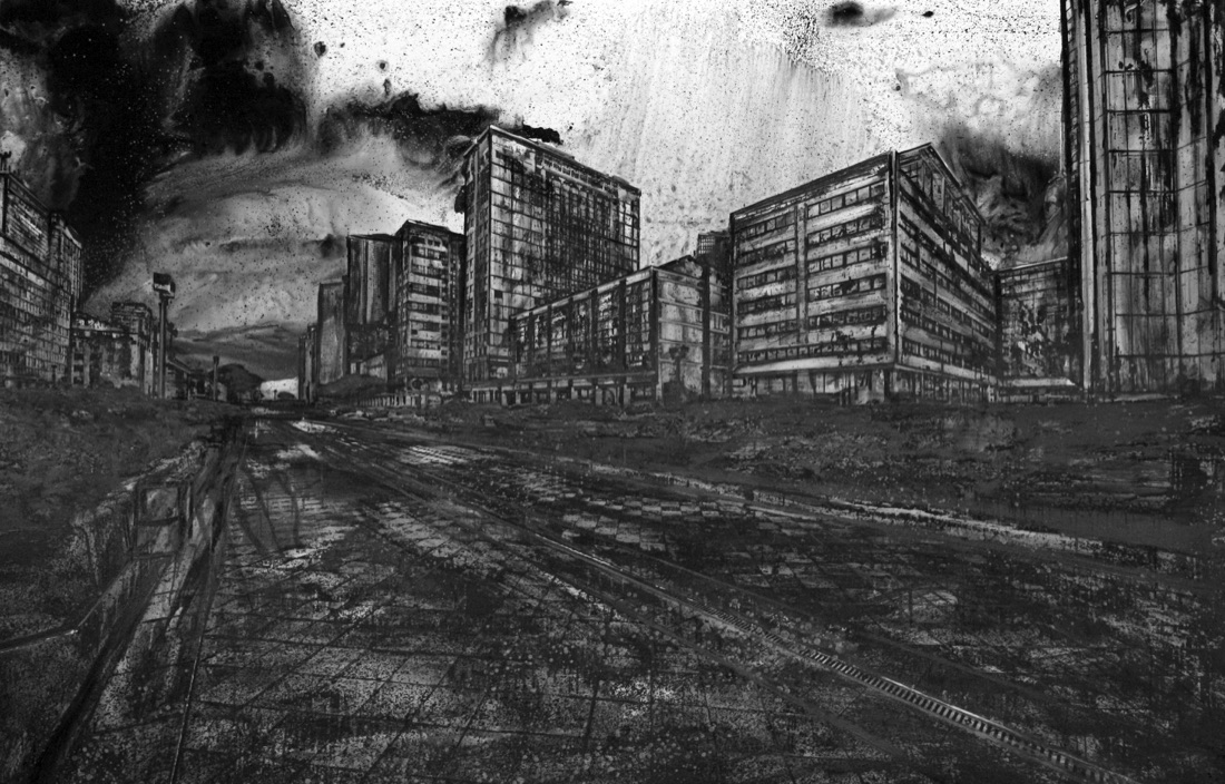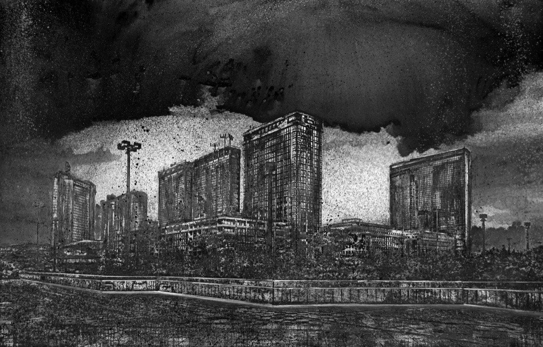 La città è al centro dell’indagine di Christian Leperino, artista napoletano classe 1979, che racconta le sue periferie, i tetti delle raffinerie, le cisterne ossidate, i muri di cemento segnati, le sopraelevate. Le disegna per descriverne gli umori, le luci e le atmosfere in opere in pvc di grandi dimensioni (157×240 cm) dal titolo Cityscape.