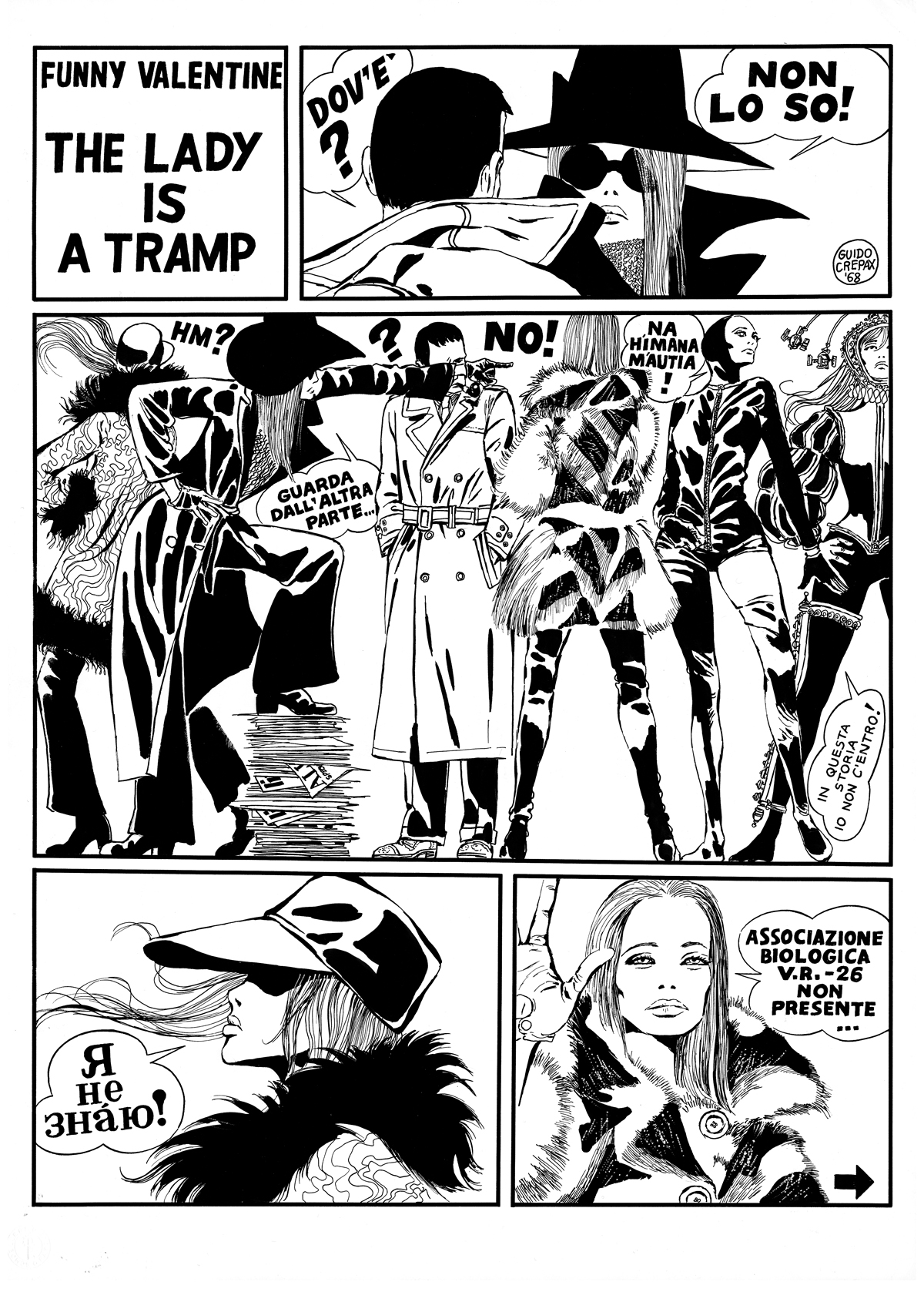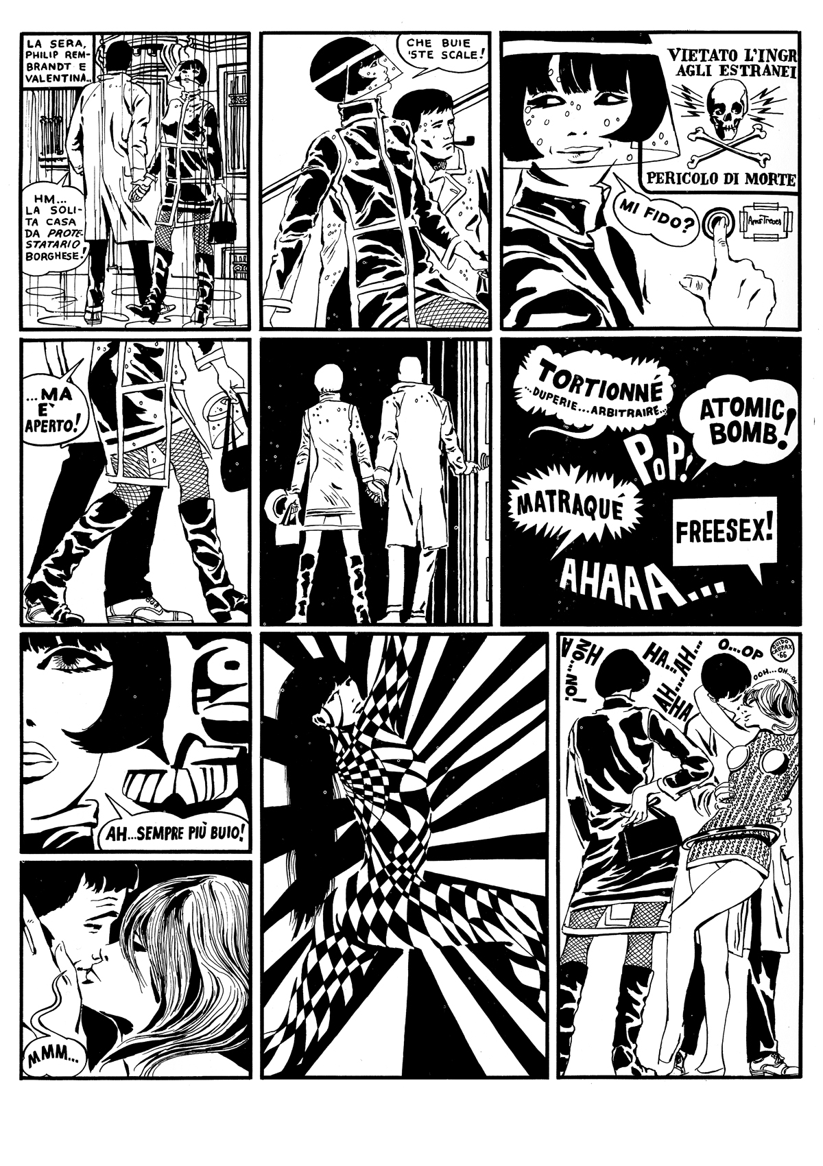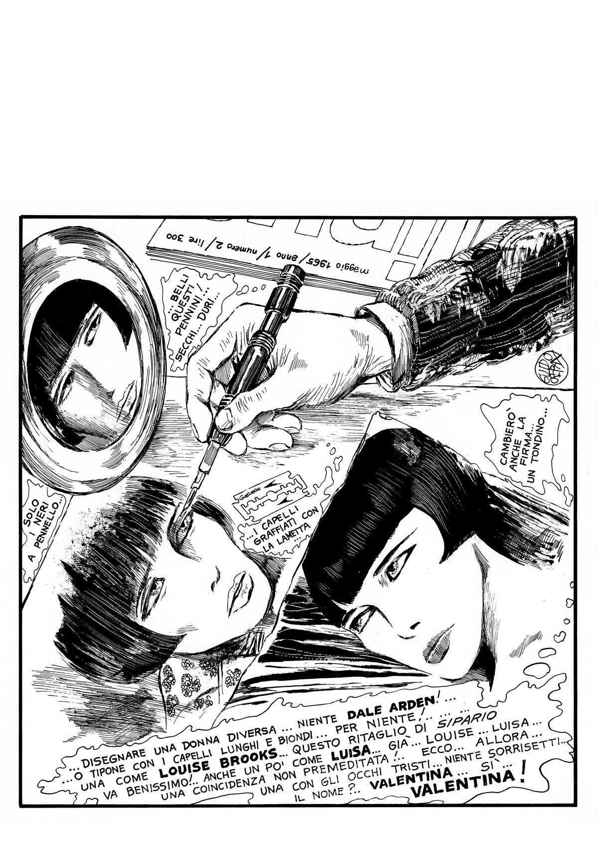 Il viaggio inizia con la sala dedicata a Milano, la sua città, i cui palazzi, gli interni delle abitazioni borghesi e i cortili sono i luoghi frequentati da Valentina. Si prosegue con una parte dedicata a Valentina e le altre (Bianca, Anita, Belinda, Giulietta e l’ultima nata Francesca), dove se la prima incarna un erotismo sensuale, Bianca è la più libera, Belinda la ragazza yeye e Francesca la prima a vivere in una famiglia allargata, cosa che Crepax era molto lontano dal concepire. Ma c’è anche Baba Yaga, disegnata al culmine della sua maturità narrativa, ovvero il perfetto opposto di Valentina. E poi le sale dedicate al Design, alla Moda, al Cinema, alla Musica e alla Fotografia. Tutte le sue passioni in circa 90 tavole, piene di citazioni: da Castiglioni a Blow up.
