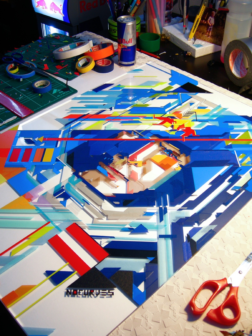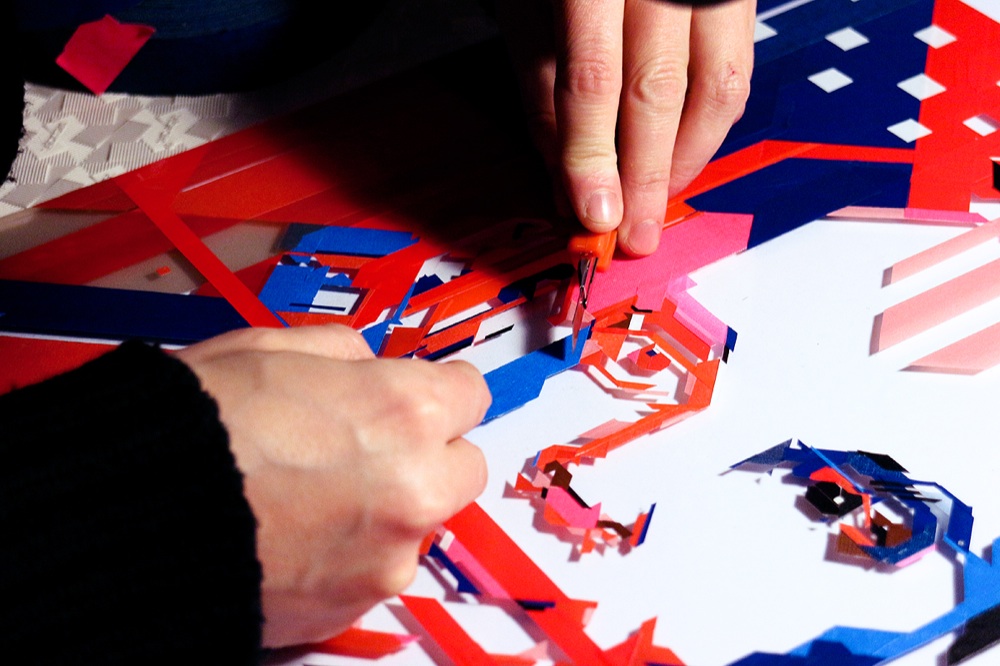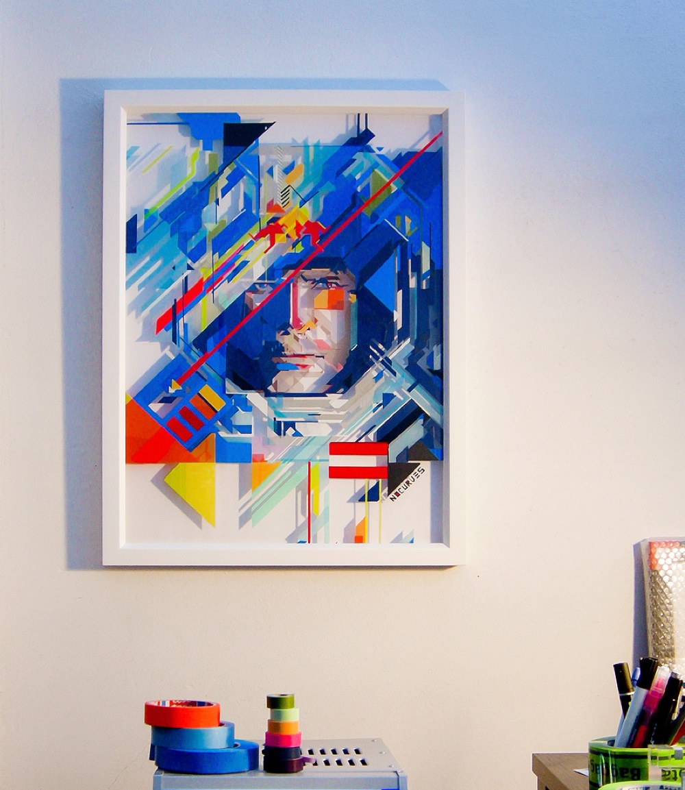 Tape Art. Si chiama così la tecnica utilizzata dal giovane italiano fra i più grandi esponenti a livello mondiale dell’arte di disegnare con il nastro adesivo: un attrezzo che, da materiale di lavoro, si trasforma in uno strumento decorativo utile per creare immagini futuristiche fatte di linee nette e angoli che ricordano le grafiche digitali.