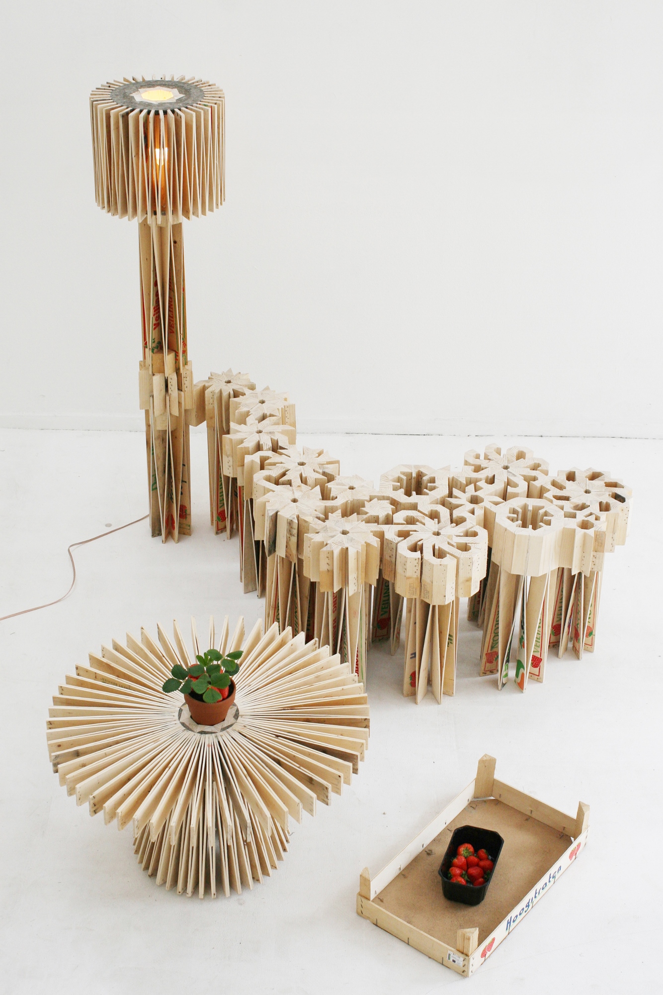 "130" di Henry Baumann è il progetto vincitore del 6° premio tedesco per il design riciclato. La panca, la lampada e il tavolo sono fatti con cassette della frutta.