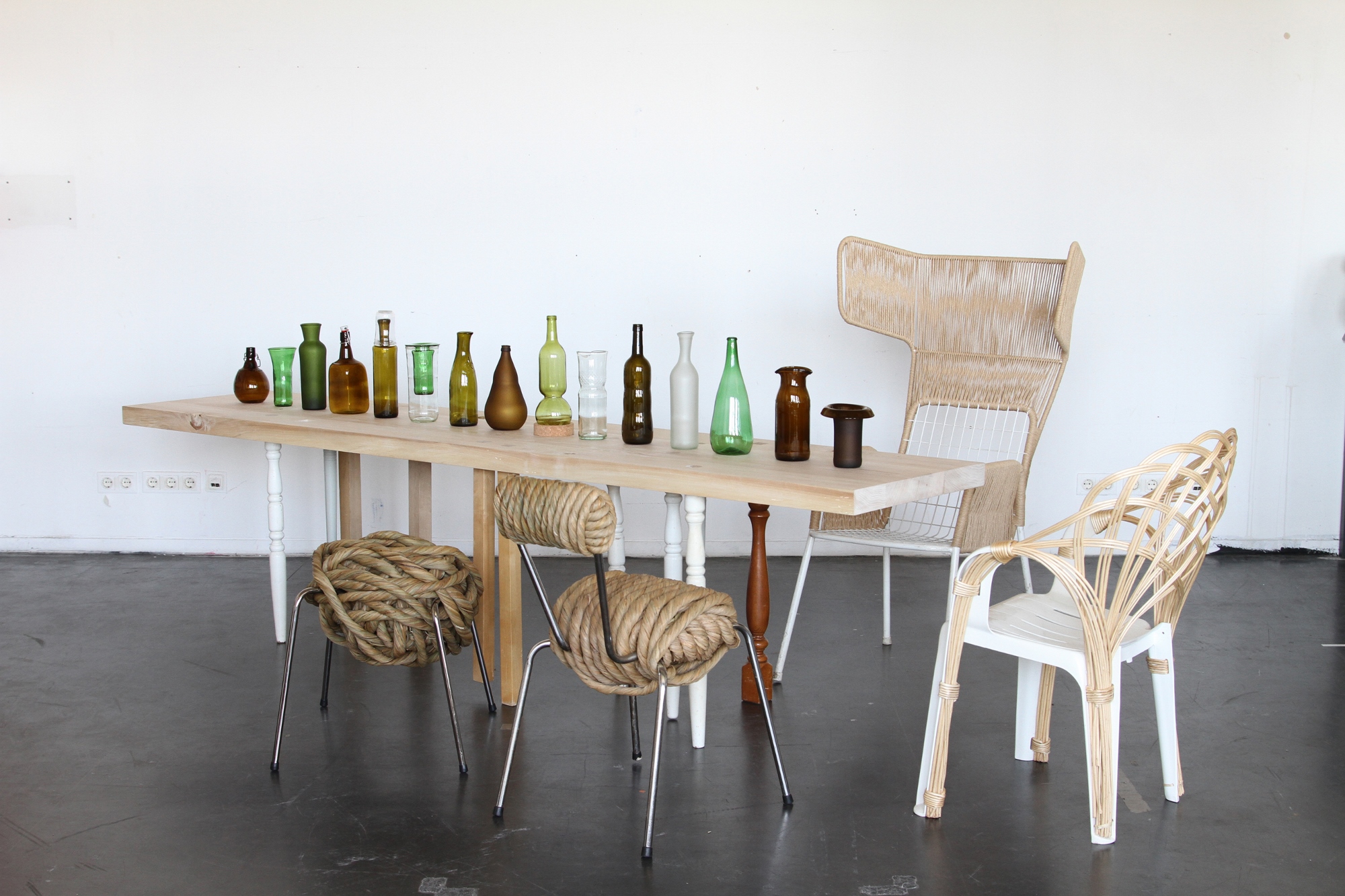 "Same, same, But different" di Laura Jungmann. Il tavolo e le sedie sono fatte con vecchi pezzi di tavoli e sedie ricombinati, mentre i contenitori sono fatti con vecchie bottiglie di vetro