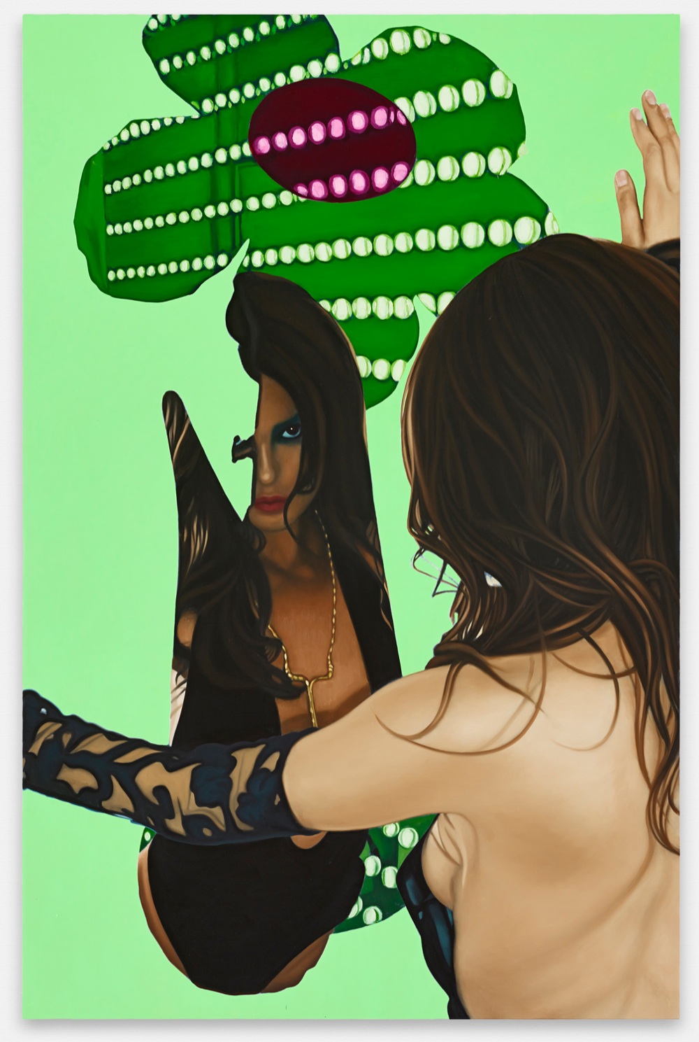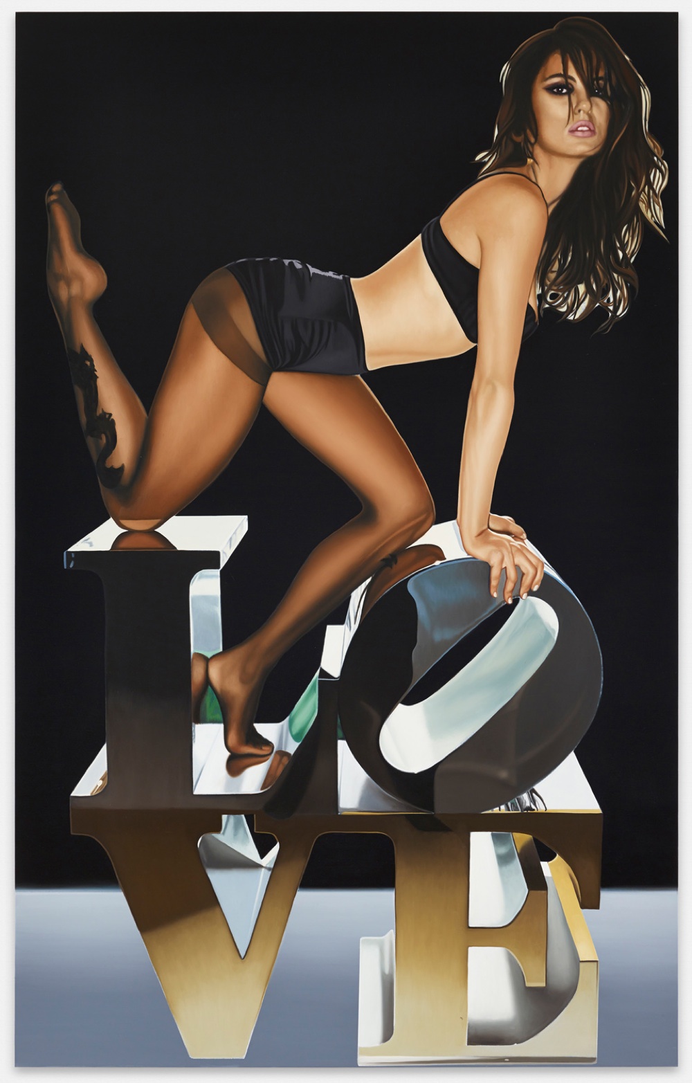 Non a caso i quadri sono stati realizzati a partire dalle immagini di un servizio fotografico scattato a casa della stilista Lisa Perry, proprio nel bel mezzo del display della sua collezione d’arte. Phillips flirta con il linguaggio della pubblicità, ritraendo la modella come una pin-up seminuda e, certamente, anche con un certo immaginario alla Playboy, a cui non è nuovo: risale al 2013 infatti l’installazione (presentata durante Miami Art Basel) realizzata in collaborazione con la rivista fondata da Hugh Hefner, dove aveva voluto esibire accanto alle playmate un’automobile Dodge Charger rivisitata. Ora da donne e motori, vira su donne e Pop Art.