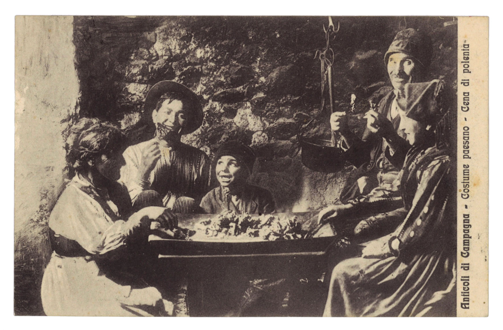 A PRANZO – Cena di polenta. Anticoli di Campagna (Roma), 1913 circa
