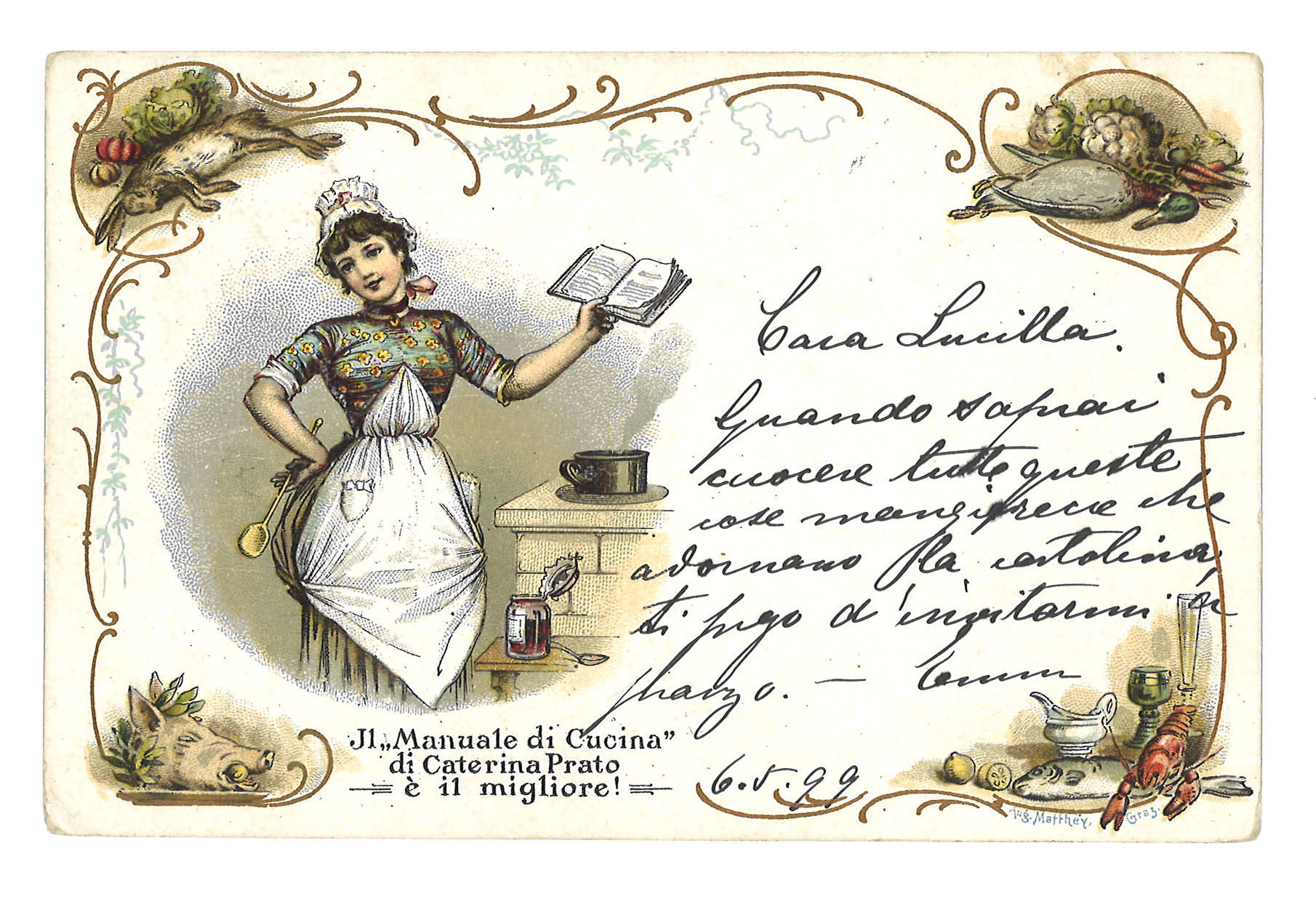 A PRANZO – "Il Manuale di cucina" di Cateerina Prato è il migliore. Creazione di Aug. Matthey per un’edizione triestina, 1899
