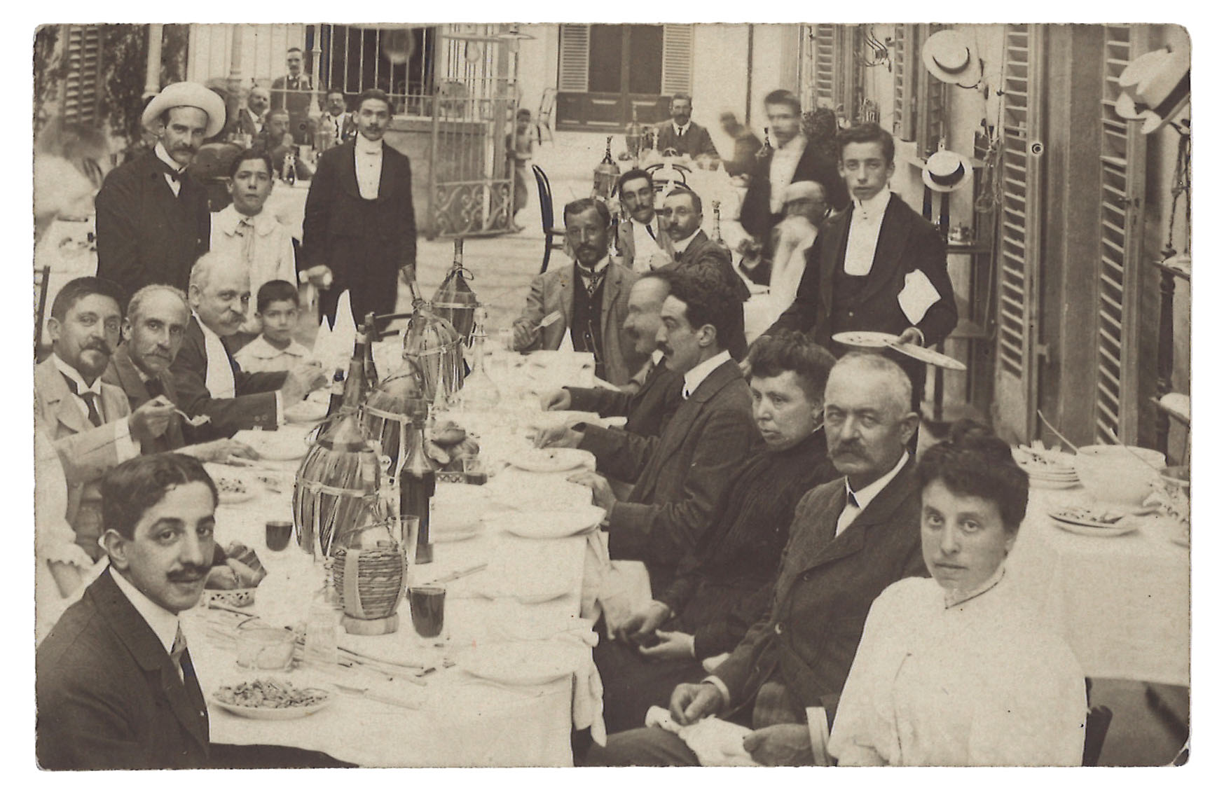 ALBERGHI E RISTORANTI – "Dopo il convivio: musica e allegria. Foto ricordo "cartolinizzata"senza indicazioni, 1926 circa