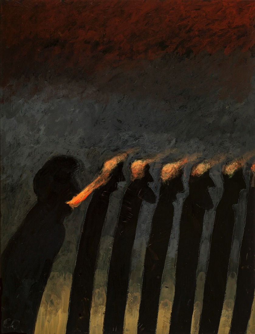 Gli sbalzi d’umore implicano una dinamica che si scopre, nell’immagine, vicina alla violenza ma controllata costantemente da sottili raffinatezze e da un lavoro delicato sui colori e sullo sfondo. Ma sulle dolcezze sono anche stati versati neri minacciosi e inquietanti.
