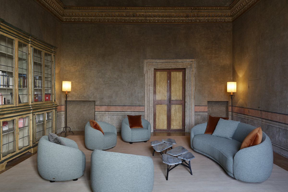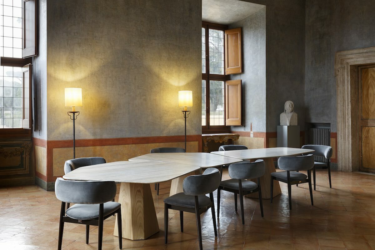Ma come continuare a rappresentare la storia non solo di Villa Medici ma della stessa Roma all’interno dei saloni? La soluzione è stata trovata grazie all’invito di alcuni designers a intervenire con la loro sensibilità negli ambienti, mediante la realizzazione ad hoc di arredi. Il lastricato di Via Appia ha ispirato i tavolini creati appositamente per il Salon de Lecture e il Salon Bleu di Noé Duchaufour-Lawrance; il riverbero delle tonalità arancio-ruggine della pittura murale del Petit Salon si ritrovano sul divano Sandia, disegnato da Toan Nguyen e prodotto da FENDI Casa, mentre le sedie Belleville, disegnate da Ronan ed Erwan Bouroullec e prodotte da Vitra, sono invece protagoniste del Grand Salon di Villa Medici.