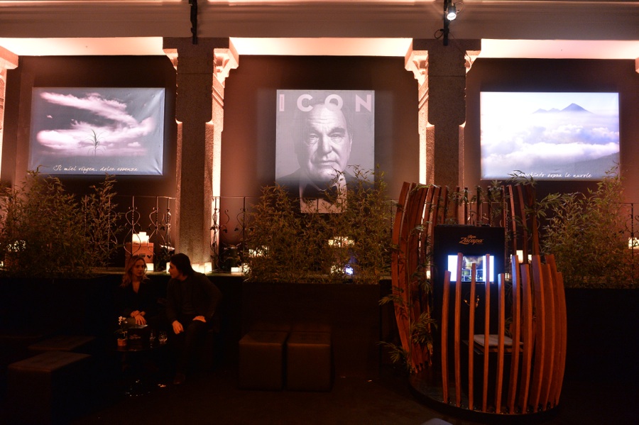 Alle pareti, tra fusti di canna da zucchero da cui si estrae il miel virgin ingrediente principale di Zacapa, le installazioni illuminate della cover del numero 13 di Icon, che ritrae Oliver Stone fotografato da Michelangelo Di Battista, e proiezioni video di immagini che raccontano la produzione e la lavorazione del rum.