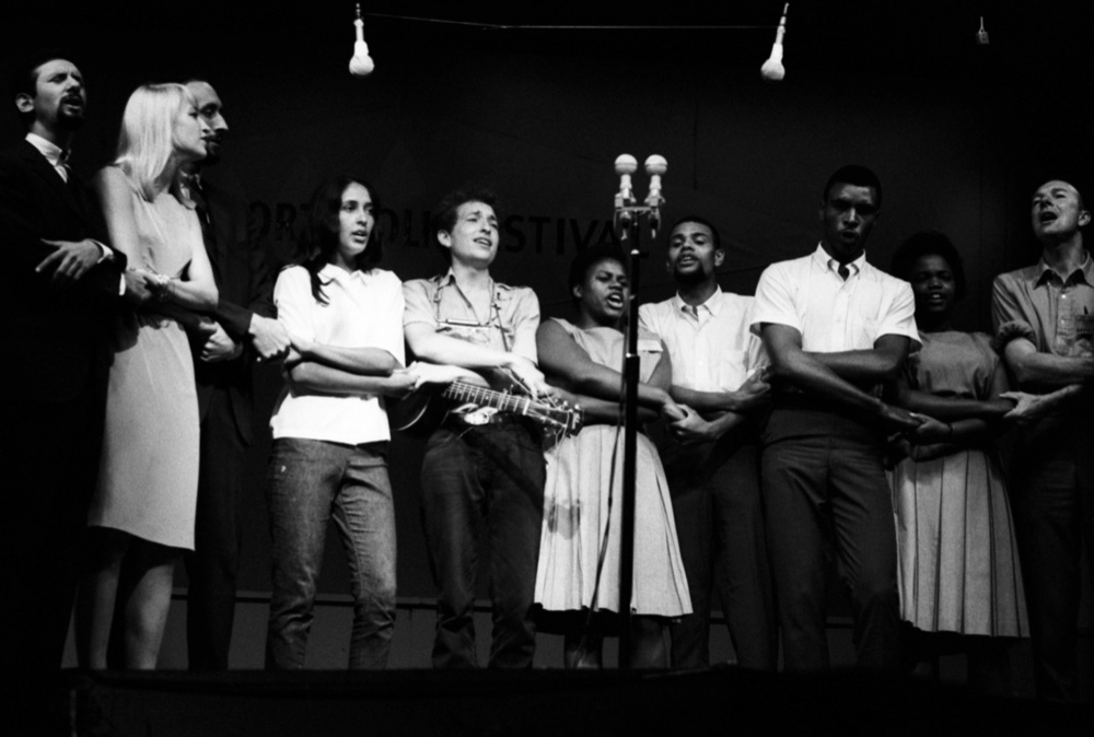 NEWPORT, RI – JULY 1963: An encore ensemble (L- R: Peter Yarrow, Mary Travers, Paul Stookey, Joan Baez, Bob Dylan, Bernice Reagon, Cordell Reagon, Charles Neblett, Rutha Harris, Pete Seeger) sing the civil rights anthem “We Shall Overcome’ at the finale of the Newport Folk Festival in July, 1963 in Newport, Rhode Island. (Photo by David Gahr/Getty Images)