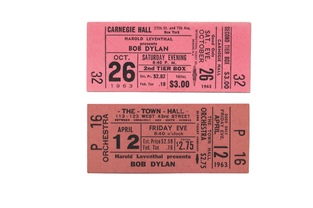 Due biglietti dei concerti di Bob Dylan del 1963 a New York (credit: ufficio stampa)