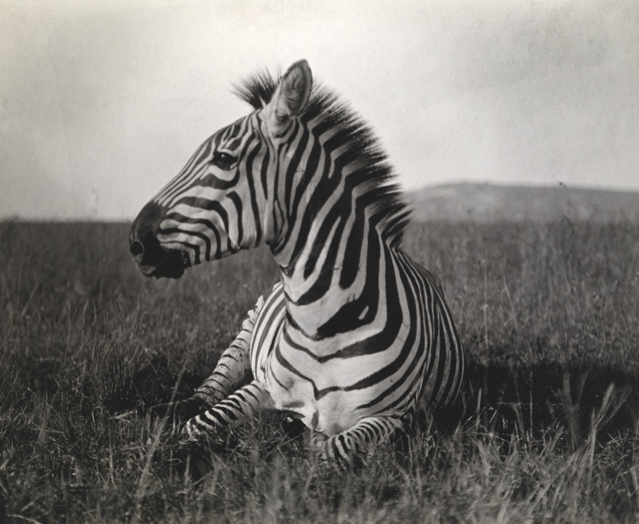 Carl E. Akeley – Kenya, 1910 circa. Akeley riuscì a cogliere questo primo piano straordinariamente dettagliato di una zebra di Burchell che riposava nelle pianure di Athi.