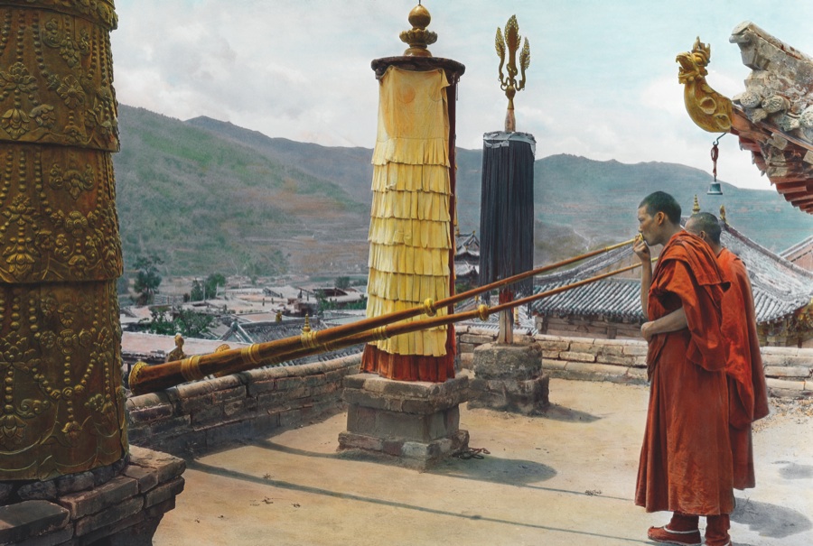 Joseph Rock – Choni (Tibet), 1926. Prima del sesto giorno della sesta luna i monaci suonano corni lunghi oltre quattro metri per sollecitare i lama a prepararsi per l’antica danza chiamata Chamngyon-wa.