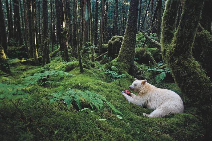 Paul Nicklen – Canada, 2011. Addentratosi nella verdeggiante foresta pluviale della regione costiera della Columbia Britannica, Paul Nicklen ha scattato questa bella e rara immagine di un orso kermode, detto anche orso spirito, quasi completamente bianco.
