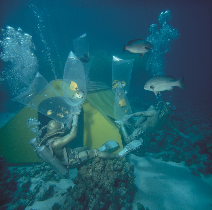 Robert Goodman – Mar Rosso, 1963. I sommozzatori del progetto Conshelf II di Jacques Cousteau difendono dai predatori affamati i campioni che hanno raccolto nella loro “casa” sottomarina.