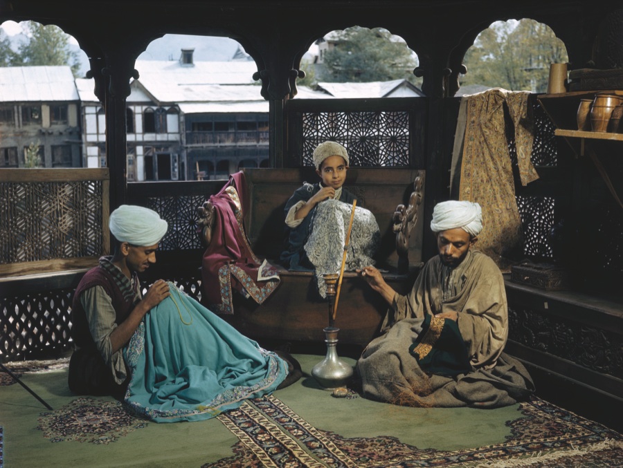 Volkmar Wentzel – India, 1947 Seduti su un balcone affacciato sulla valle del Kashmir alcuni tessitori con il turbante fumano insieme una pipa ad acqua.