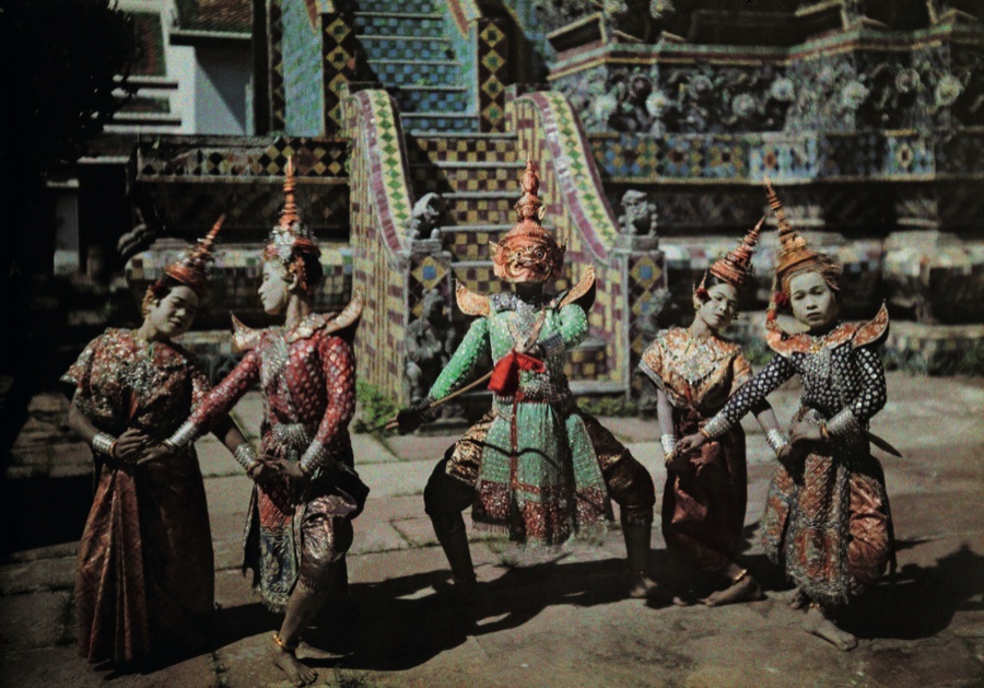 W. Robert Moore – Siam, anni Trenta circa. Un gruppo di danzatori rievoca alcuni episodi della vita di Phra Ruang fuori da un tempio.