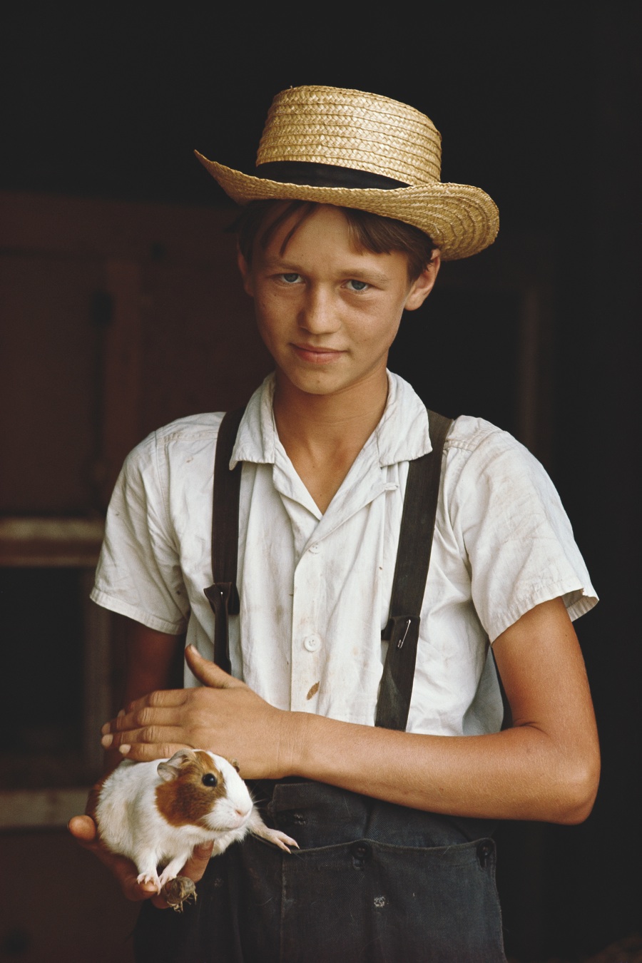 William Albert Allard – Pennsylvania, 1965. Un giovane amish con un cappello di paglia e le bretelle accarezza un porcellino d’India.