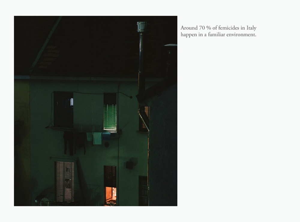 Questa scelta non è semplice da tradurre in un racconto visivo, ma Arianna mettendo insieme immagini simboliche, scatti notturni di edifici apparentemente anonimi, riproduzioni di fotografie storiche, rappresentazioni di dichiarazioni d’amore sui muri, riesce a raccontare la storia del femminicidio documentando, ma soprattutto emozionando lo spettatore.