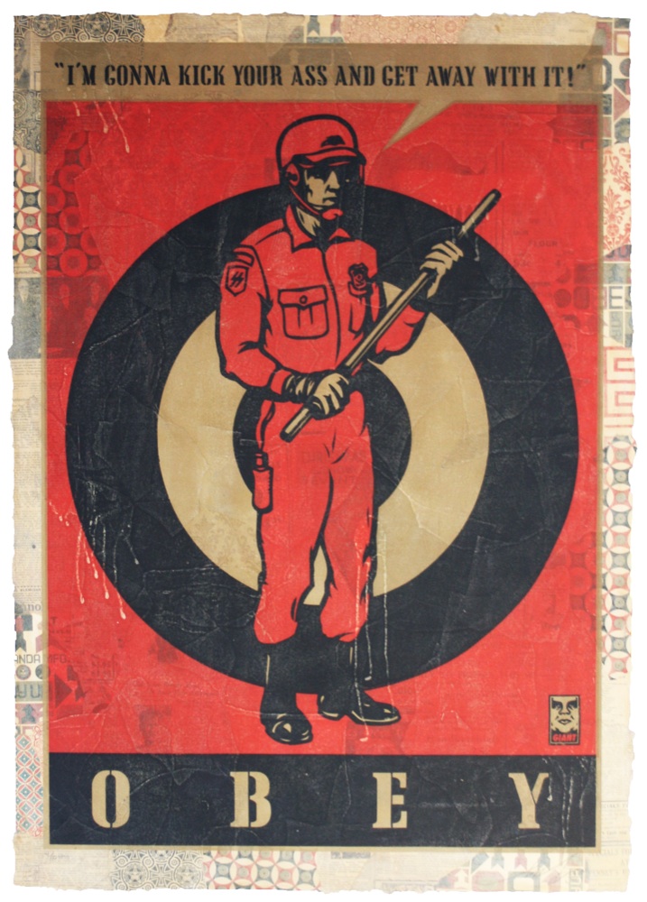 E di sicuro Obey – questo è il soprannome di Fairey – ha creato un’icona pop che sarebbe molto piaciuta ad Andy Warhol. Ora il Palazzo delle Arti di Napoli gli dedica una personale, dove si possono ammirare, oltre ai ritratti del Presidente, anche Jaws Wave, Engineering, Print Destroy, oltre a Kick your ass. Il messaggio è esplicito, forte, chiaro e perentorio. Una replica non è ammessa.