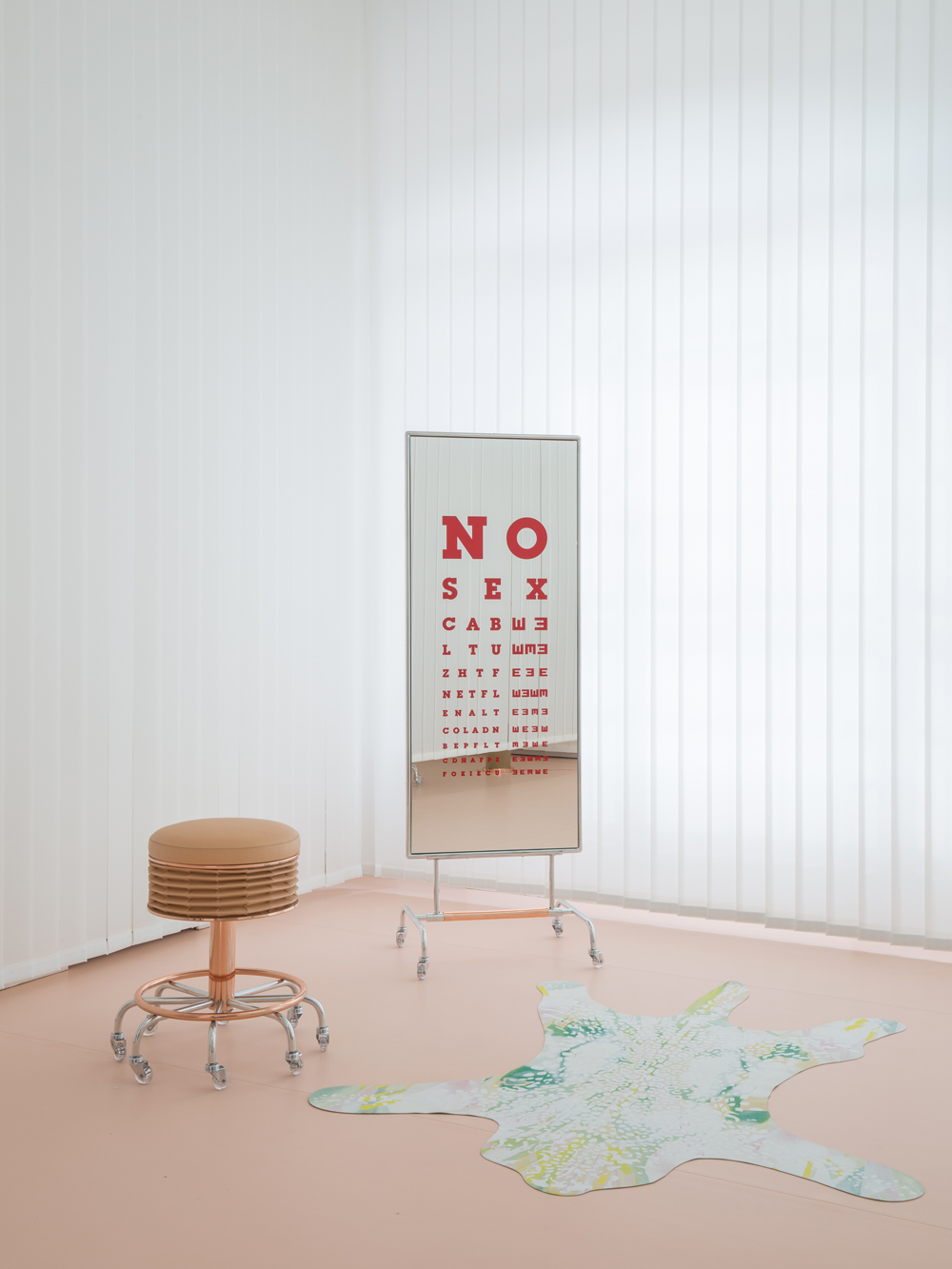 The sexiest: Resina rosa a terra, tendine bianche come quelle che si trovano negli istituti di bellezza per dividere gli ambienti. La clinica immaginata da Atelier Biagetti è “un luogo felice” dove ci si può disintossicare dal sesso_ “serve come rifugio dal costante e invadente bersagliamento di immagini sexy e sentirsi finalmente soddisfatti, protetti, curati e salvati” scrive la curatrice Maria Cristina Didero. E uscirne forse ancor più disinibiti ed eccitati di quando si è entrati. Con NO SEX, loro, il designer Alberto Biagetti e l’artista Laura Baldassari, per viaggiare sul filo del rasoio ce la mettono tutta e il risultato è pregevole per forma e sostanza: il day-bed in pelle chiara e caucciù ha inserti estraibili, strategicamente posizionati all’altezza dei seni e della testa, la sedia è come quella del dentista, ma è color cipria e rosate sono anche le parti metalliche su otto rotelle trasparenti, i side-table hanno i ripiani in acciaio riflettente posati su cilindri in silicone. Toccare per credere. Durante l’evento di apertura ad accogliere gli ospiti c’erano due “dottoresse” gemelle molto giovani e molto sexy (le designer Elena e Giulia Sella, fondatrici del blog DesignByGemini) e una squadra d’infermierine animava la serata. Servite rigorosamente da maschi in camice bianco, le bevande alcoliche.