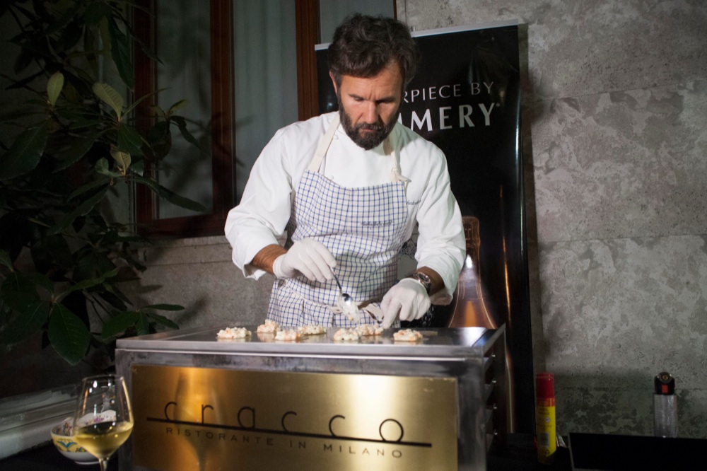 La serata ha avuto inizio nel cortile affacciato sulla Piazza con uno showcooking dello chef che ha preparato live la mitica Insalata Russa Caramellata, un must della cucina di Cracco. E poi verdure essiccate al naturale, sfoglie di patate e riso e uova di quaglia allo zafferano mentre gli ospiti si accomodavano al tavolo. Il resto della cena è una danza di gamberi di Santa Margherita con pistacchio e barbabietola, di ravioli di crostacei con pomodoro, basilico e arancia e di cubi di milanese con petali di pomodoro ripieni di zucchine e menta. Il dolce è un tripudio di colore, la crema di crescenza alla vaniglia nel centro del piatto viene sporcata dallo chef con una pennellata di frutti rossi e sorbetto al lampone. Chapeau allo chef.