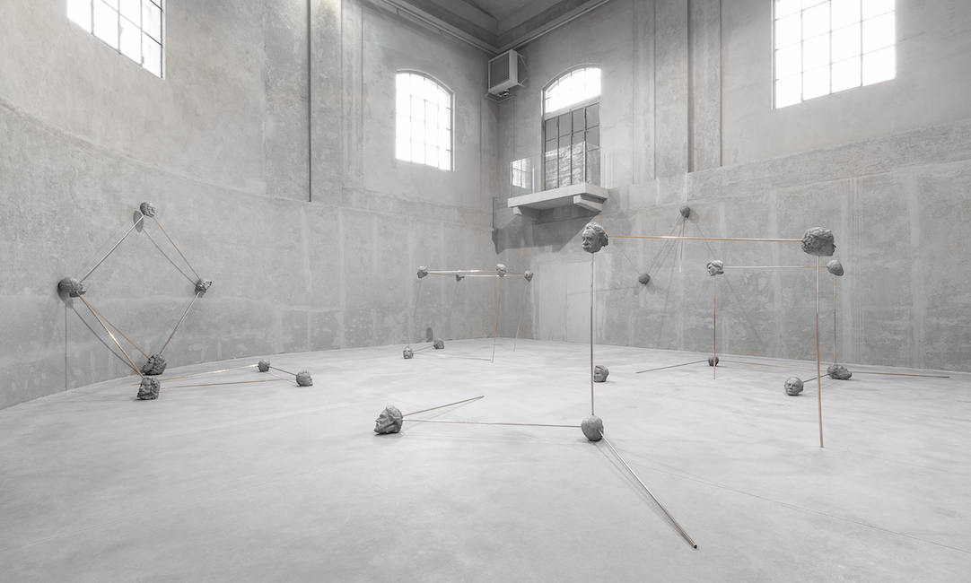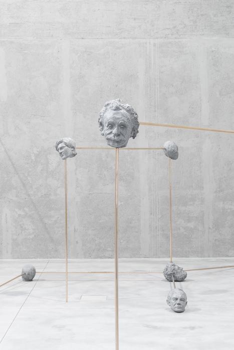 I grandi pensatori, che all’essere artificiale hanno prestato le loro frasi, tornano infine nella ragnatela di teste interconnesse da lunghe barre metalliche nello spazio brutalista della Cisterna: la struttura ricorda l’iconografia con cui è rappresentata la molecola e l’opera pare auspicare a una leadership intellettuale piuttosto che politica. Tra i 61 personaggi cesellati nel bronzo compaiono Albert Einstein e Sigmund Freud, che si confrontarono a colpi di lettere sulla possibilità di arginare la violenza nel mondo (la documentazione è inclusa nella mostra), e Mary Shelley, la creatrice di Frankestein, a cui allude il man-made-man nel Podium.