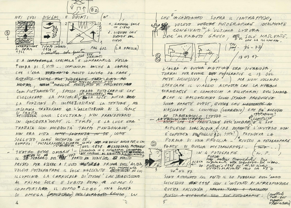 Con la sua forma a “L” ribaltata e i due cerchi incrociati, tipico motivo dell’architettura scarpiana, il monumento venne eretto tra il 1970 e il 1978, anno un cui lo stesso Scarpa se ne andò improvvisamente a causa di un incidente e venne portata a termine dai suoi collaboratori. Carlo Scarpa verrà sepolto in un angolo discreto nello stesso cimitero del paese dove si erge la sua Tomba Brion. La mostra milanese, Col tempo- Nei dintorni di Carlo Scarpa, è una raccolta di un centinaio di fotografie che evidenziano la ricerca quasi scientifica condotta dal fotografo di Cesena sul progetto dell’architetto veneziano, di cui fu tra l’altro allievo.