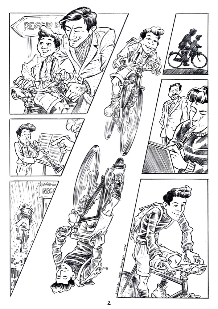 Insomma: un personaggio. Come personaggi sono anche Cristian Neri ed Elena Accenti, disegnatore, illustratore e fumettista lui, sceneggiatrice e autrice lei. La mostra parla di Henghel e del suo clarinetto (l’io del titolo) e nasce da una serie di incontri iniziati nel 2010 dei due fumettisti con chi Henghel lo conosceva bene: direttori d’orchestra, la moglie cantante, il fratello pianista (ben documentate sul sito raccontandohenghelgualdi.blogspot.it).