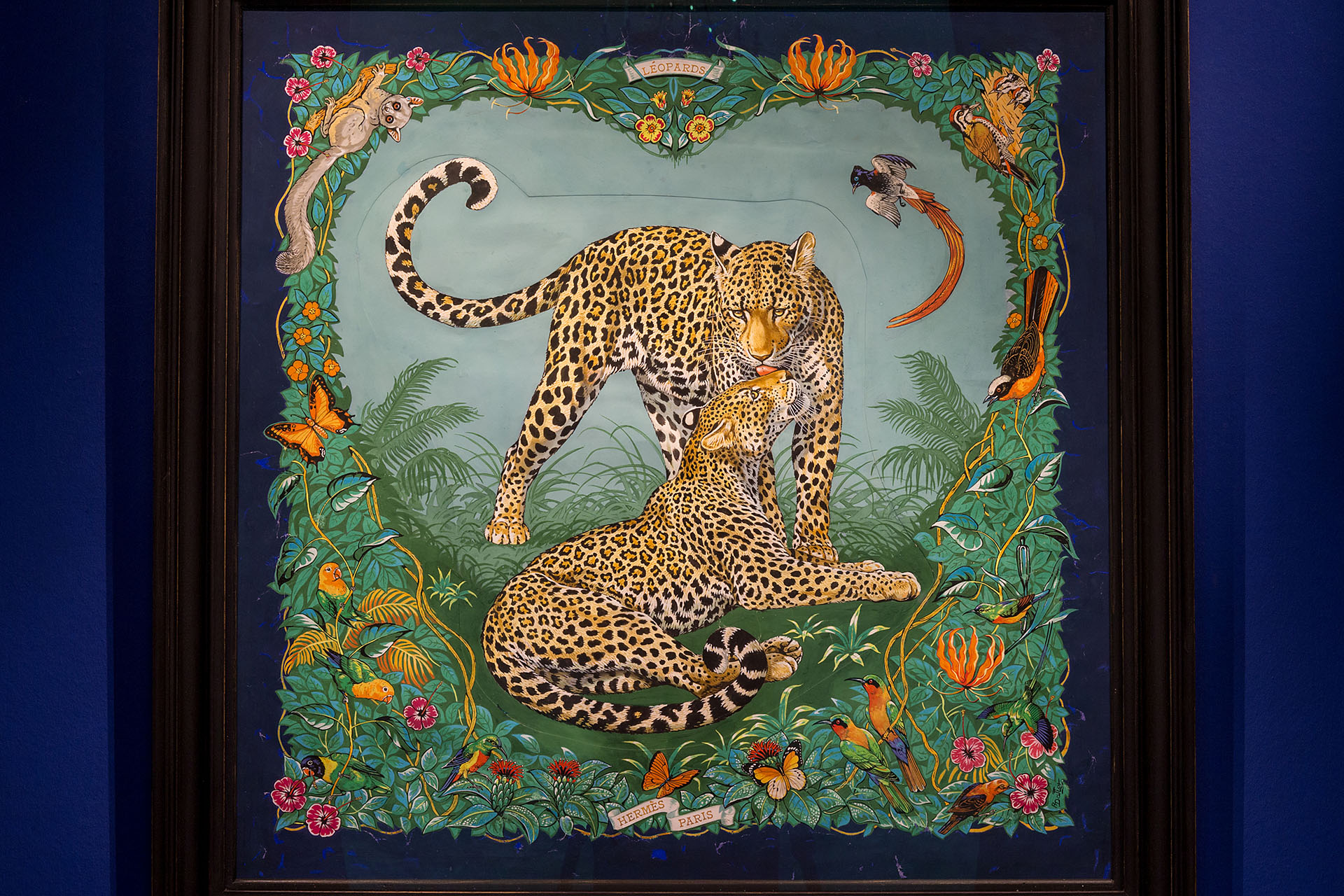 Del suo tratto e dei suoi magici leoni, ghepardi e leopardi si innamorò anche Jean-Louis Dumas, che fu presidente della maison, e iniziò dal 1988 con l’artista la collaborazione che ha portato a realizzare iconici carrés, come Jungle love (del 2000) Tendresse féline e Les Tigreaux (stampati nel 2012). Molti dei lavori esposti provengono infatti dalla collezioni Emile Hermès, altri direttamente dalla collezione privata della famiglia di Dallet.