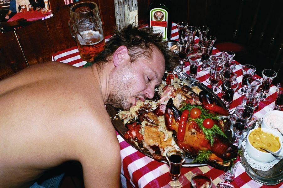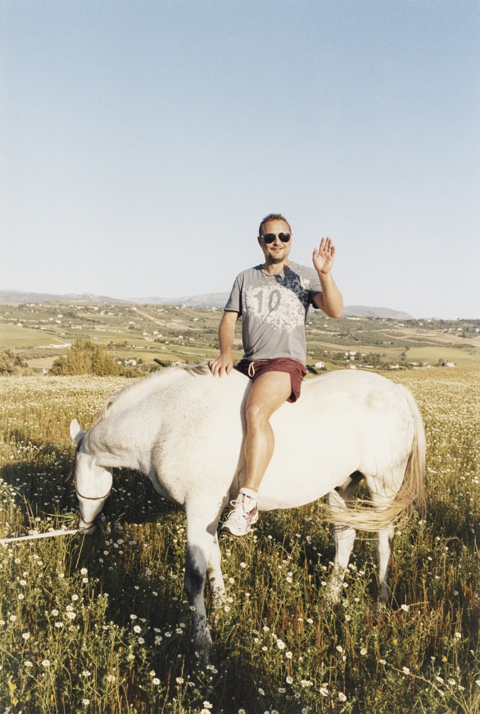 E allora lo vediamo a fare ginnastica nel tentativo di mantenersi in forma, oppure collassato con la testa nel piatto, ubriaco con gli amici, travestito mentre gioca con la figlia, ma anche – come un Velázquez moderno che include se stesso, l’artista, nel dipinto – abbracciato a Charlotte Rampling in una camera d’albergo o con un piede nella foto di Kate Moss.