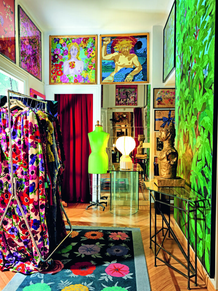 Giusto per dare qualche spunto di riflessione: ha inventato le sfilate-spettacolo, il co branding, il fluid gender (si diceva unisex), il total look, ha fatto di se stesso, ben prima di Franco Moschino o Ralph Lauren, il testimonial della sua griffe, ha disegnato mobili e oggettistica, aperto un ristorante… Quel gran genio di George Kenneth Scott, per tutti solo Ken Scott, ha fatto e anticipato in 50 di attività davvero tutto: non a caso Alessandro Michele (anch’egli, come Scott, innamorato dei fiori e della natura) da quell’abile miscelatore di tante belle e perdute idee di ieri qual è, ha voluto fare una collezione – Epilogue – attingendo al formidabile archivio lasciato dal designer americano (per carità, non stilista!, termine che detestava: «Lo stilista seleziona le idee degli altri, non crea. Preferirei essere chiamato designer»). Mettersi a raccontare Ken Scott significa scrivere un librone e quello, per fortuna, ora c’è, coloratissimo come la moda del designer (‘posseduto’ dal colore, come il suo idolo Paul Klee), semplicemente sfogliabile, se si vogliono guardare le figure, ma anche ampiamente corredato di testi ottimi per chiarezza e piacevolezza di lettura che aiutano a comprendere come un artista cui Peggy Guggenheim guardava con (comprensibile) interesse abbia potuto diventare una figura chiave della moda del 900.