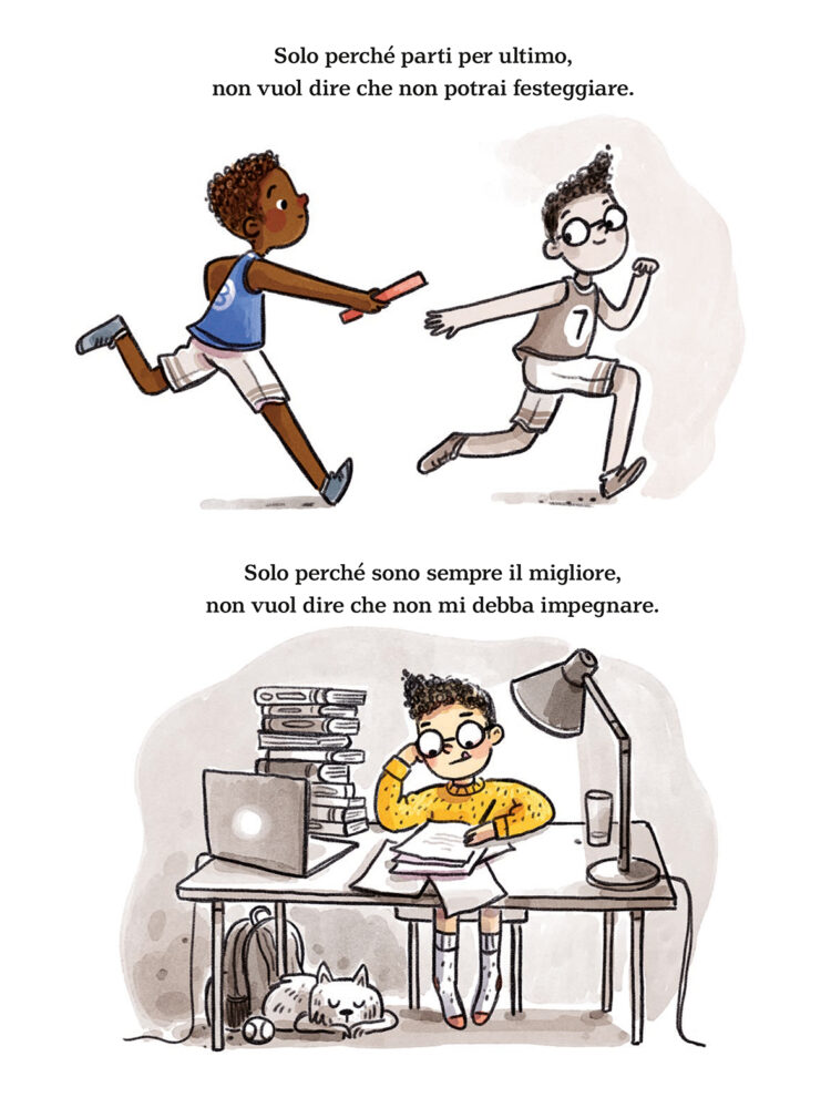 Benché sia un libro illustrato, giocato su coppie di illustrazioni (opera della bravissima Renée Kurilla) i pensieri che lo compongono sono nati per stimolare la conversazione tra i lettori grandi e piccini, proprio come è avvenuto in casa McConaughey. “Solo perché mi hanno chiuso fuori, non significa che non abbia vinto”, dice un bimbo in sedia a rotelle arrivato troppo tardi alla partita di baseball, che però riesce a vedere da una breccia nella staccionata. La morale? La vita è complessa, non c’è mai una sola verità; bisogna sempre fare uno sforzo per capire le ragioni degli altri. Mica facile. Ai piccoli piacerà. E i grandi sono avvisati: meglio leggerlo prima (sono una quarantina di pagine, ce la si può fare) e prepararsi le risposte alle domande di spiegazione che, scommettiamo? fioccheranno.