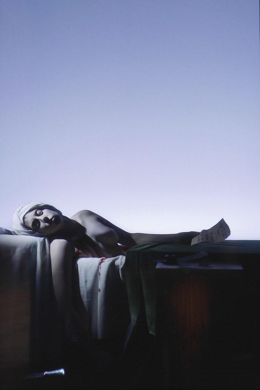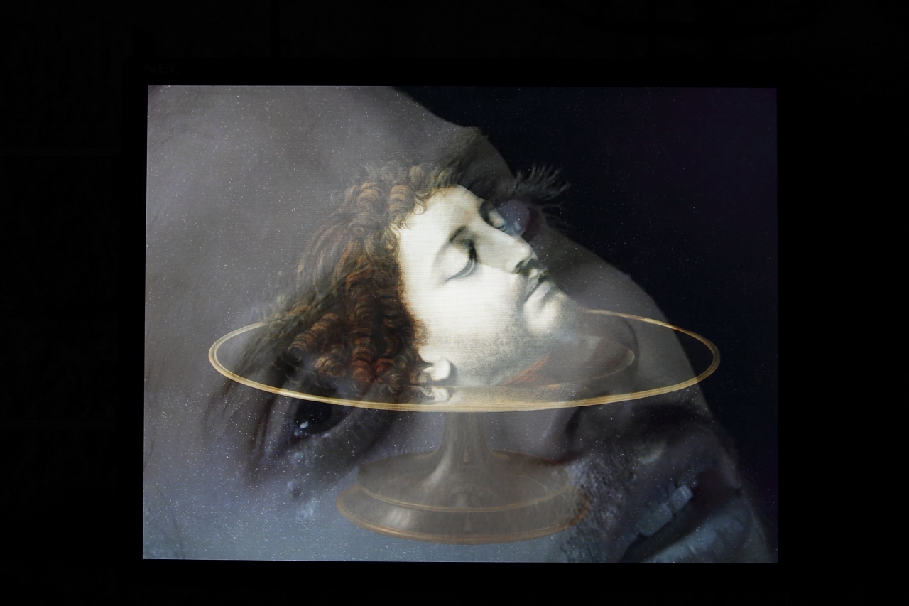 In una serie di video in slow motion, il volto dell’artista si fonde a quello di Mademoiselle Rivière, ritratta da Jean-Auguste-Dominique Ingres nel 1806, o nella testa di Giovanni Battista offerta su un vassoio nella rappresentazione di Andrea Solario del 1507, o ancora nel corpo di Marat ne ‘La morte di Marat’ di Jacques-Louis David del 1793.