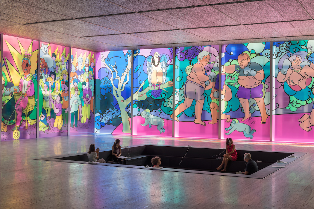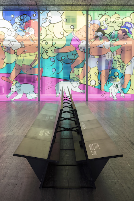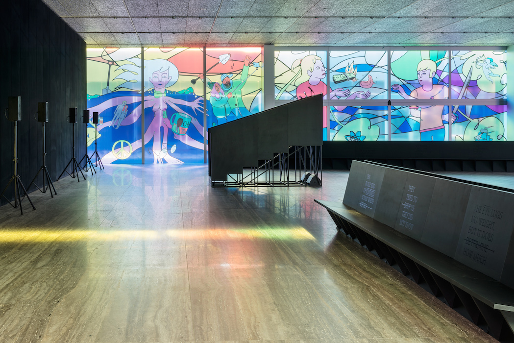 Quella di Nástio Mosquito – promettente artista classe 1981 – invece è una kermesse ben più pop, che comincia con il convertire le vetrate del Podium in superfici decorate da aneddoti popolari o assurdi, che fanno il verso nell’estetica al vetro cattedrale. “T.T.T.- Template Temples of Tenacity” è perciò un tempio laico ma pieno di spirito questo di Mosquito, dove le persone che vuole coinvolgere contano quanto la sua installazione comprendente un pulpito, delle panche, una nicchia scavata nel pavimento dove ci si può sedere ad ascoltare la sua opera sonora, per pensare e lasciare un commento sui quaderni messi a disposizione, ma anche un film – Synchronicity Is My Bitch: The Cinematic Experience (2016)- che sarà proiettato a settembre e mostra il suo eclettismo multimediale, che molto spesso mette la sua figura al centro dello show.