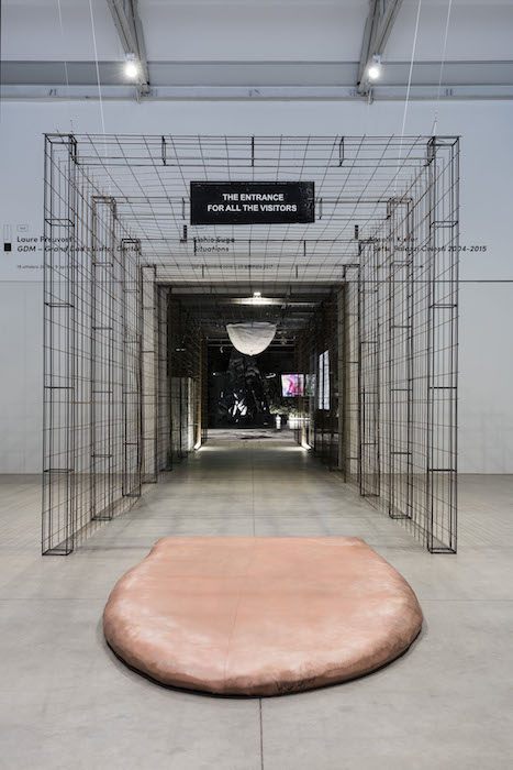 Una soffice lingua rosa stesa a terra indica l’ingresso e, immediatamente dopo, lungo il corridoio in rete metallica incombono dall’alto due grossi seni raminghi. C’è subito qualcosa di estremamente fisico in questa installazione d’altro canto immateriale e destrutturata, che parla un linguaggio smaccatamente femminile e uterino.