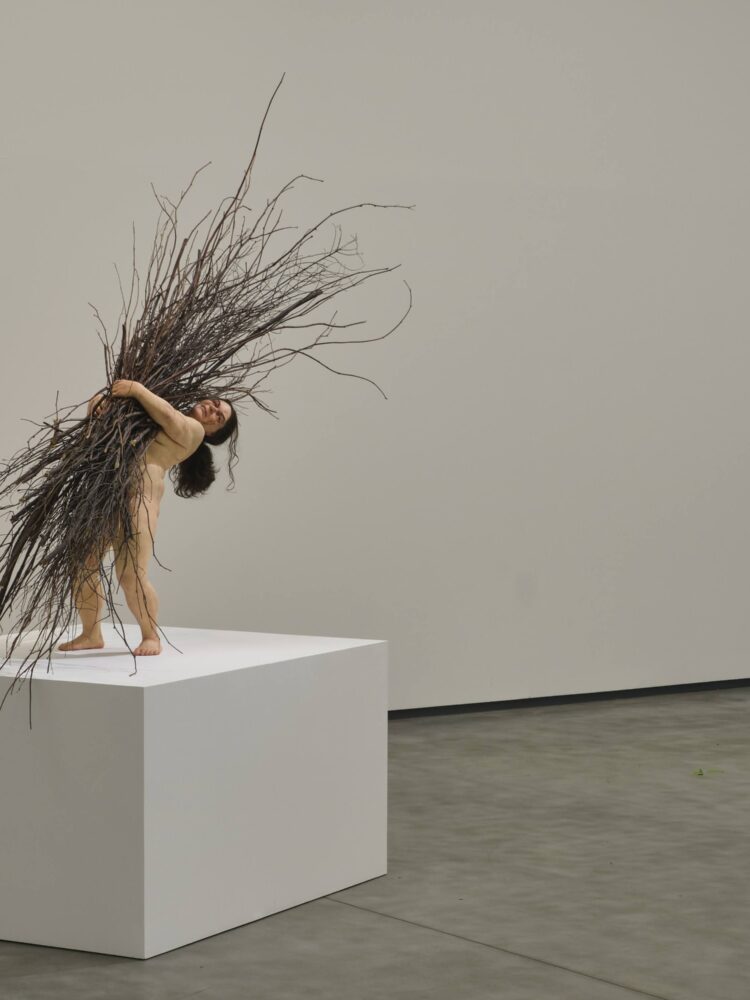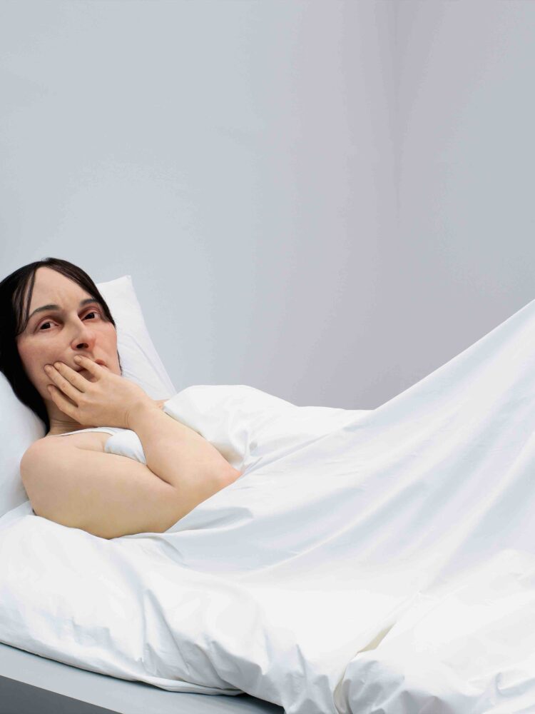 Abbandonando parzialmente la riproduzione maniacale di ogni dettaglio, Mueck punta con le opere più recenti a sottolineare l’essenza del suo lavoro, cioè la sua immediata percezione. Lo spiega molto bene En Garde (2023) un minaccioso gruppo di cani di quasi tre metri di altezza. Pochi i dettagli di superficie, ma massima è la tensione che le forme e le espressioni suscitano. Ci sono poi le opere celebri degli anni 2000, quelle di una minuzia impressionante, come In Bed (2005), una donna stesa a letto che, nonostante il fuoriscala, è assolutamente intima e delicata. E così pure, con proporzioni minori rispetto alla realtà e per questo inquietante,Woman with Sticks (2009). Da vedere, infine, assolutamente i due filmati che raccontano il modus operandi di Mueck.