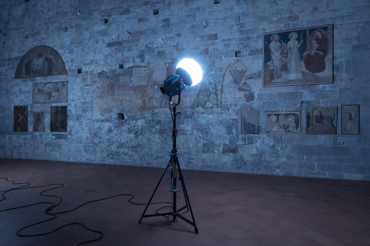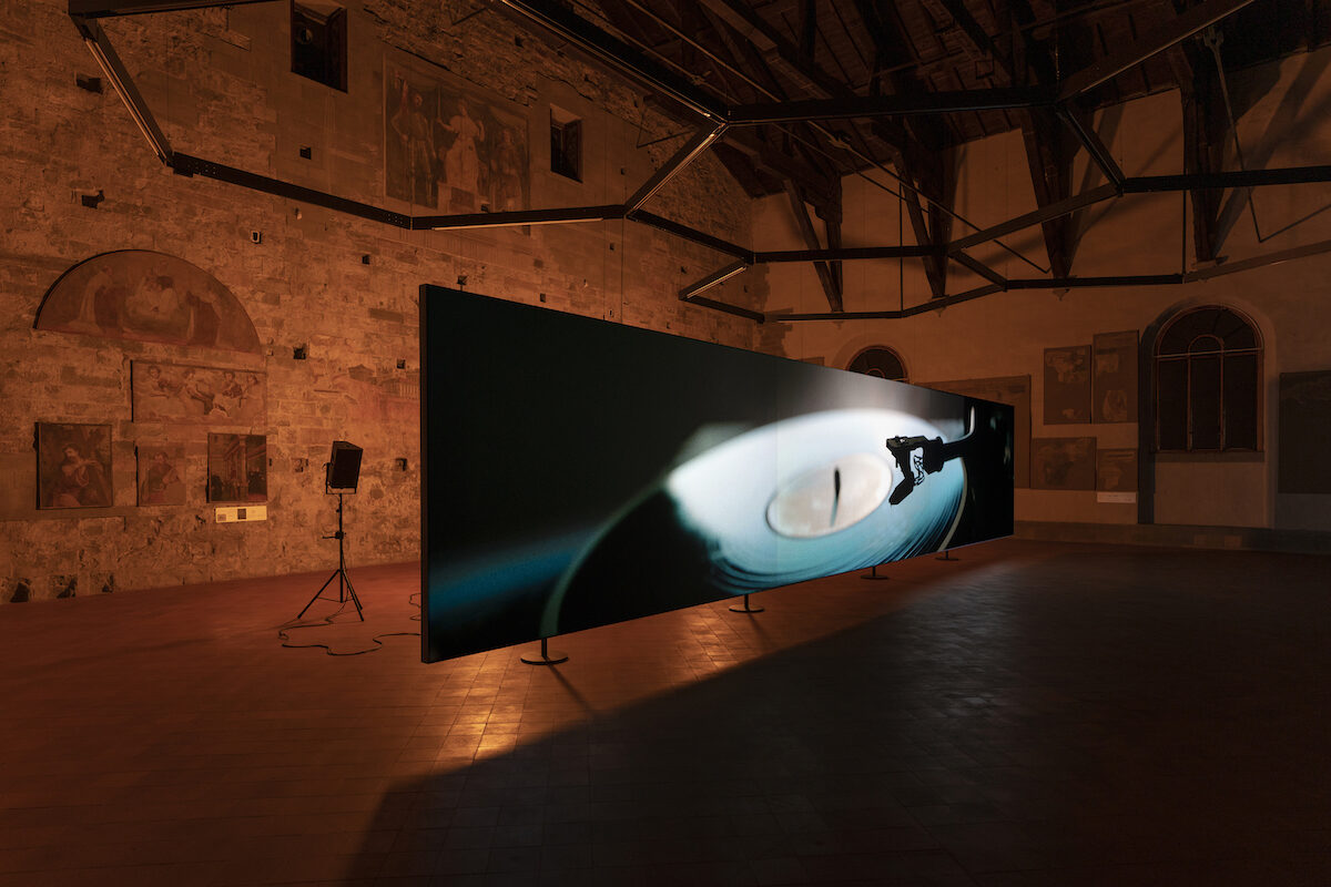 La location è spettacolare: l’iconica Sala delle Capriate del Palazzo della Ragione a Bergamo. E’ qui che è ospitata la coinvolgente opera dell’artista di origini albanesi, Anri Sala, Time No Longer. Tra centinaia di affreschi realizzati tra il Trecento e il Cinquecento, Sala propone un viaggio nello spazio siderale. Proiettato su uno schermo lungo 16 metri, Time No Longer mostra le immagini di un giradischi galleggiante in una stazione spaziale, che ancorato al solo cavo elettrico, riproduce un arrangiamento di Quartet for the End of Time, diOlivier Messiaen, considerata la più celebre opera composta in prigionia.