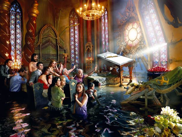 Dopo il Diluvio, la mostra che il Palazzo delle Esposizioni gli dedica dopo 15 anni di lontananza da Roma, è una tappa importante per capire l’evoluzione umana e artistica di questo fotografo surrealista che assomiglia sempre di più a un pittore del contemporaneo. Sensibilissimo alla bellezza ma anche desideroso di provocare emozione e stupore, LaChapelle elettrizza le sue immagini, dà la scossa a luoghi apparentemente ammuffiti quali alcuni musei e chiese. E le figure umane, quando ci sono, si mostrano carnali, lascive.