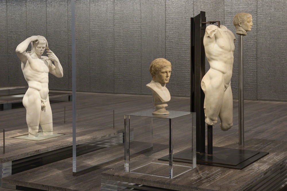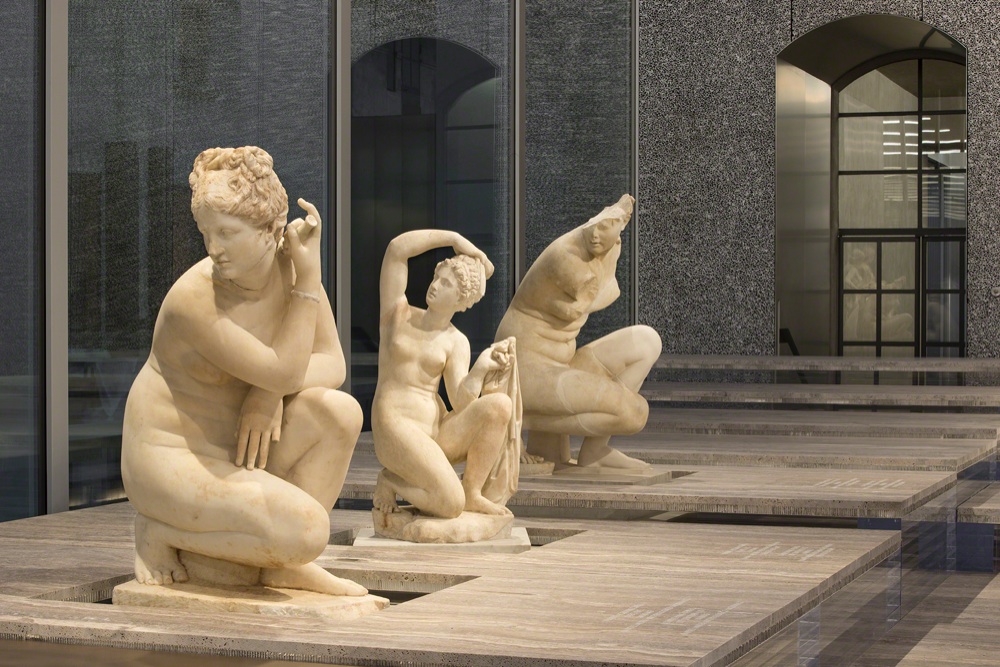 La Fondazione Prada nasce per ospitare la collezione permanente e non solo e si articola come una sequenza di comparti espositivi: nella galleria Sud, in parte nel Deposito, trova posto la mostra An introduction, con opere che datano fin dagli Anni 60, lavori che Miuccia Prada e Patrizio Bertelli hanno in questi anni assemblato sotto la supervisione e il consiglio di Germano Celant. Nella galleria Nord, a cura di Nicholas Cullinan, la mostra In part, sulla relazione tra corpo integro e le sue parti raccontata da opere di David Hockney, John Baldessari e Francesco Vezzoli tra gli altri. Nella Cisterna il Trittico di Damien Hirst, Eva Hesse e Pino Pascali. Nel sotterraneo del cinema Progetto grottesco, un’installazione di Thomas Deman che racconta il processo che ha portato alla realizzazione di una fotografia del 2006 e, al livello superiore, nell’anticamera dellla sala cinema, è stata collocata una ceramica di Lucio Fontanta che un tempo stava nell’atrio del Cinema Arlecchino a Milano. E ancora nella Hunted House attualmente hanno sede Louise Bourgeois e Robert Gober. Il cubo trasparente invece, il Podium, è dedicato alle mostre temporanee. Oggi i pavimenti in travertino sono calcati dai discoboli, le veneri e i bronzi della mostra di Salvatore Settis (con Anna Anguissola), Serial Classic, che si pone domande sul senso del classico nella nostra era e svela che la serialità non è prerogativa della modernità.