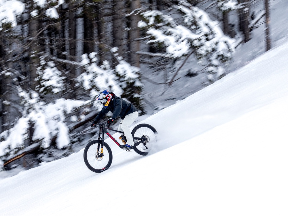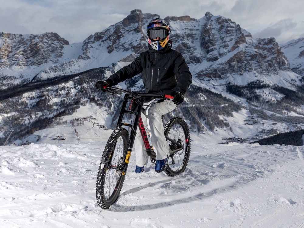 A pista ripristinata, è arrivato il momento di Marco Aurelio Fontana – mountain biker campione italiano, mondiale e olimpionico – che ha affrontato la “nera” di Coppa del Mondo in sella ad una due ruote da downhill dotata per l’occasione di speciali pneumatici chiodati.